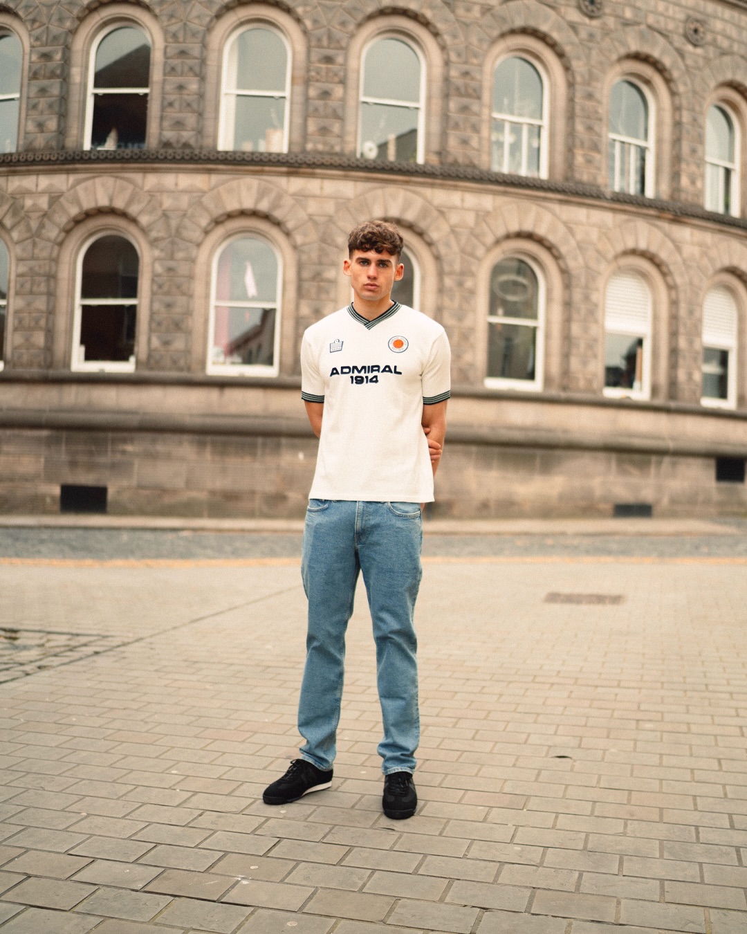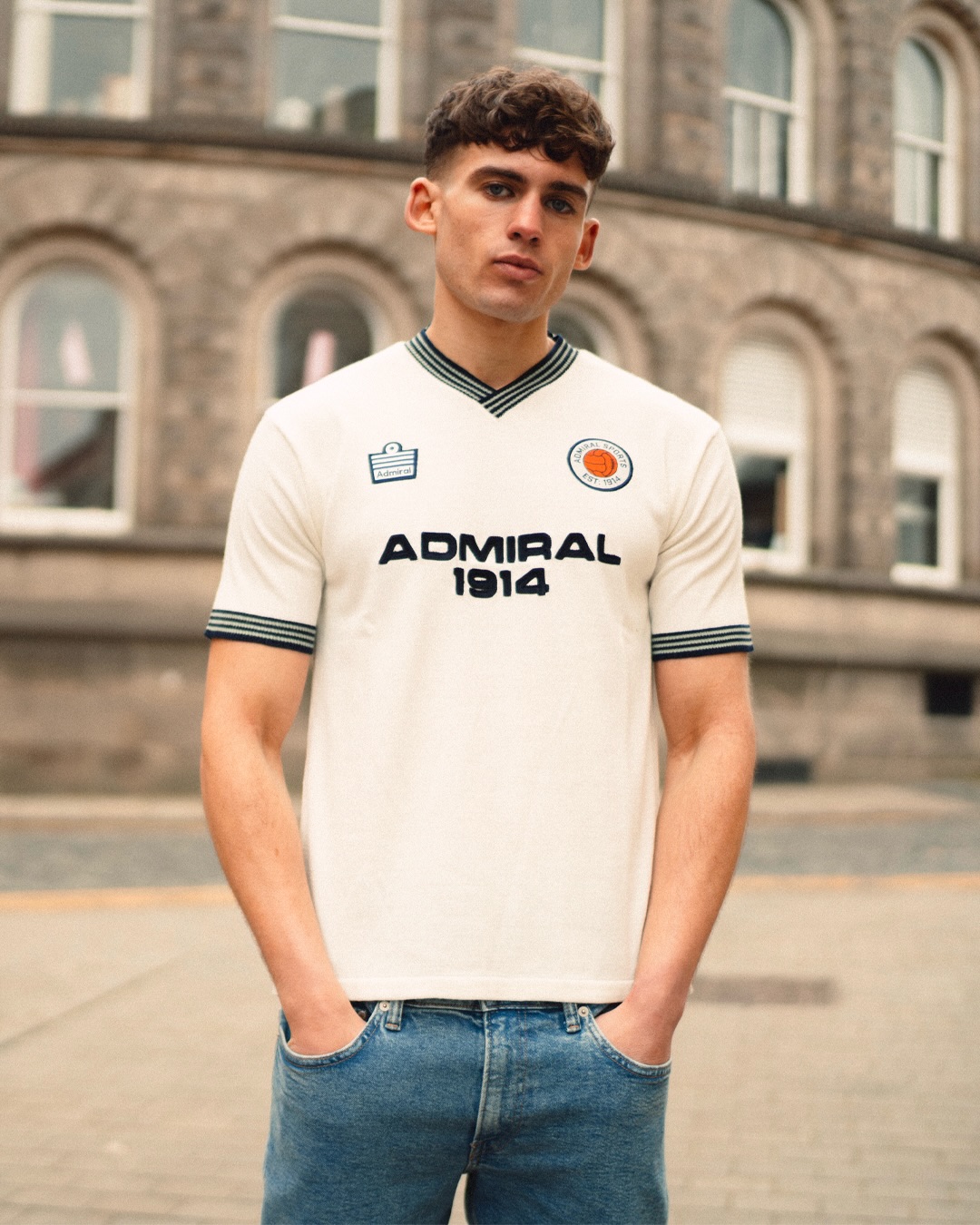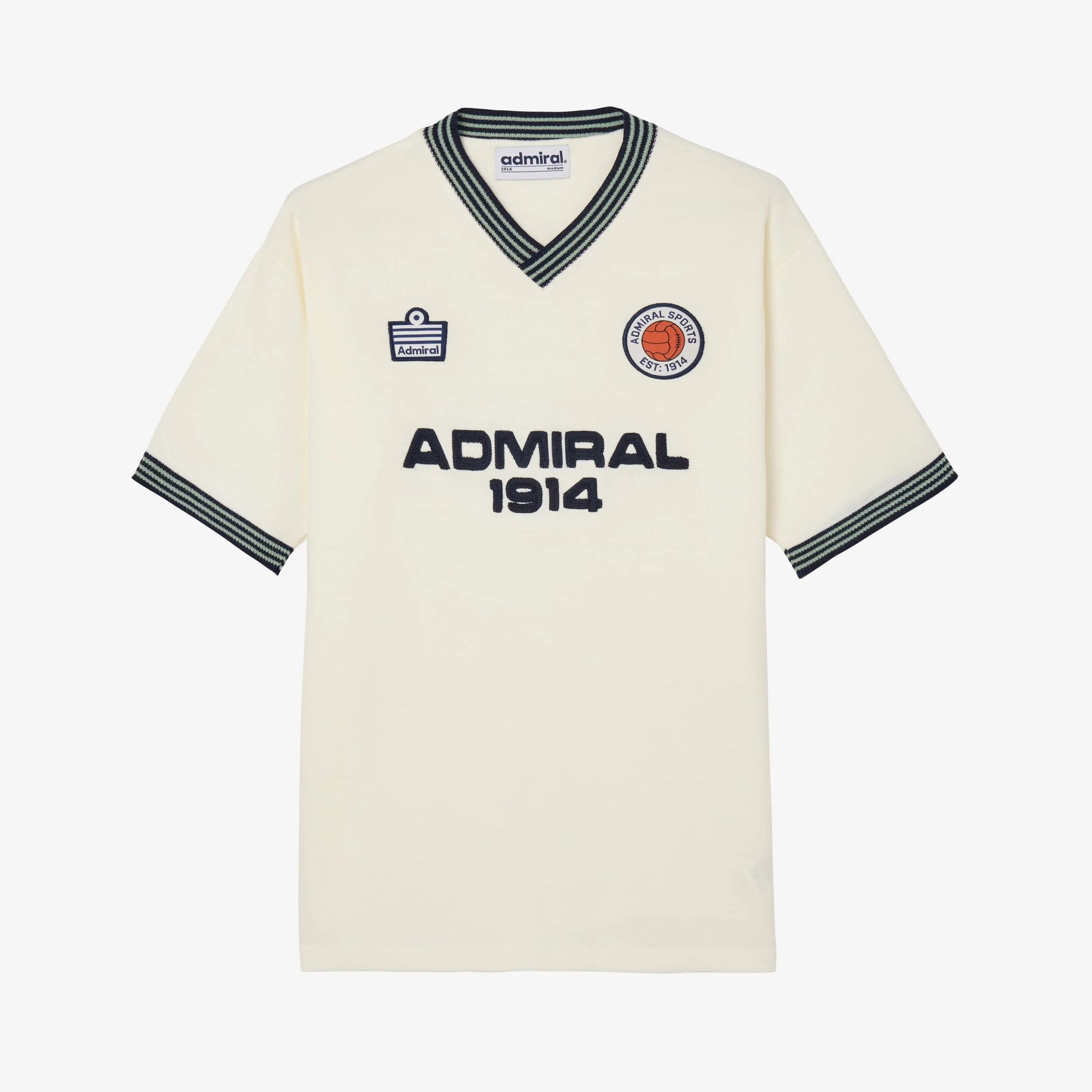 The Admiral 1914 shirt uses a regular fit with set-in sleeves, maintaining a traditional silhouette. The knit construction and ribbed trims reflect design references commonly seen in historic football kits, adapted here for a lifestyle football shirt format.