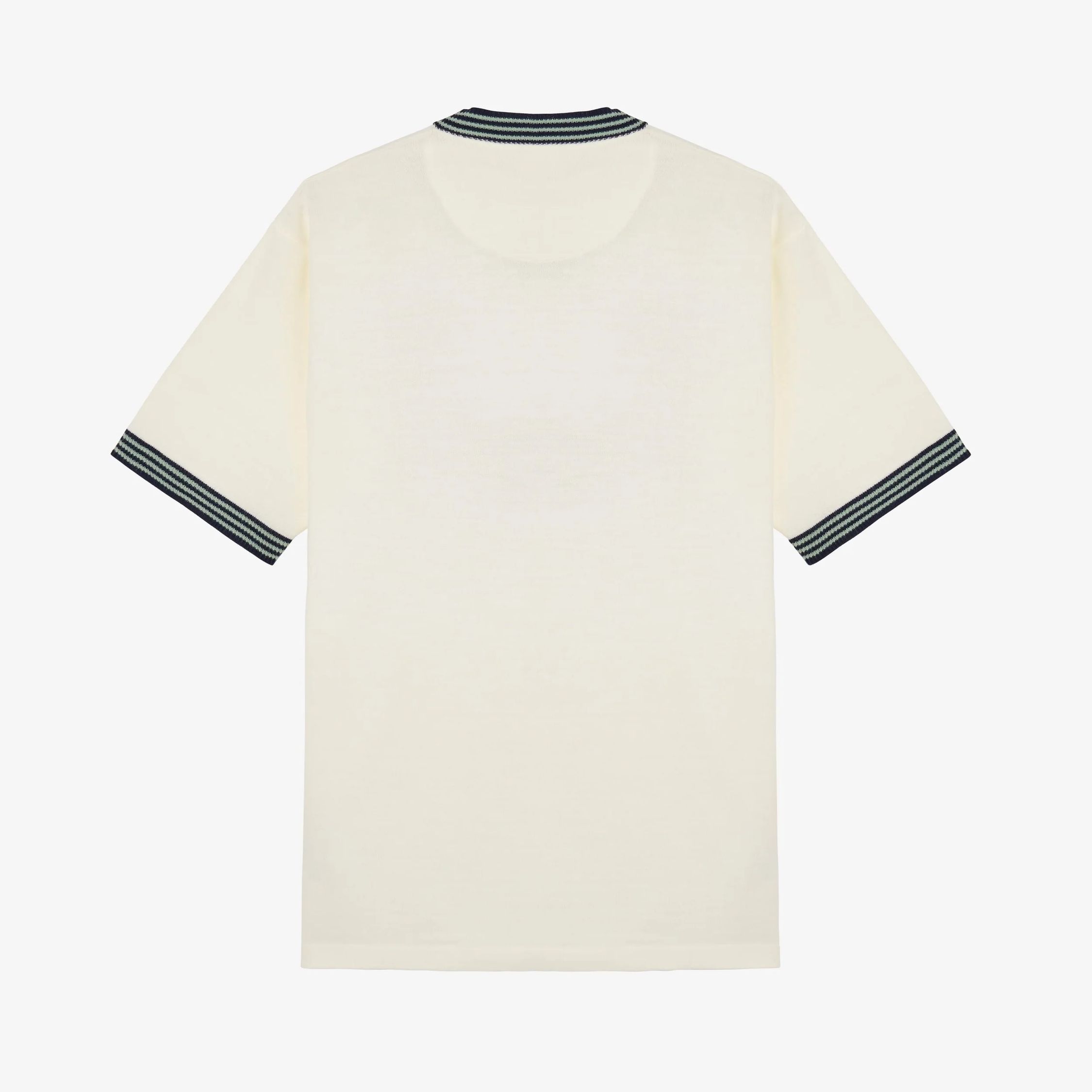 This Admiral knit shirt is constructed from premium acrylic knit fabric, providing a soft, structured feel suited to everyday use. The off-white base is paired with a ribbed V-neck collar and sleeve cuffs in green and navy, delivering a classic football shirt profile inspired by Italian knitted jerseys of the 1980s.