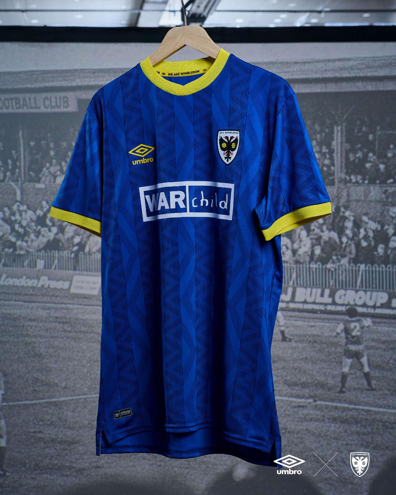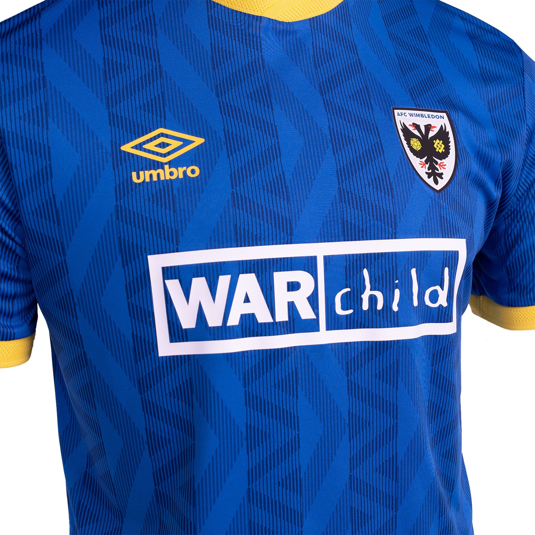 The 2024-25-season Umbro primary design boasts a look reminiscent of the forerunning Wimbledon FC’s glory years of the 1980s and 1990s through the tones of blue with diamond patterning and the yellow overlapping crew neck and the matching cuffs.
