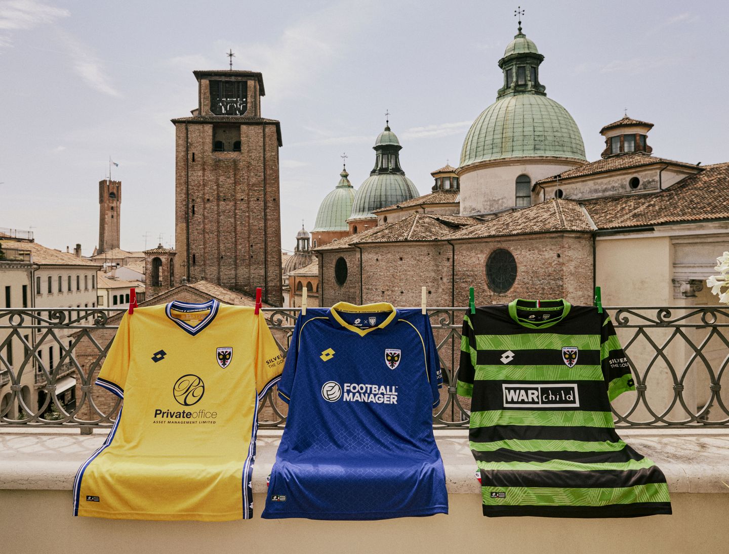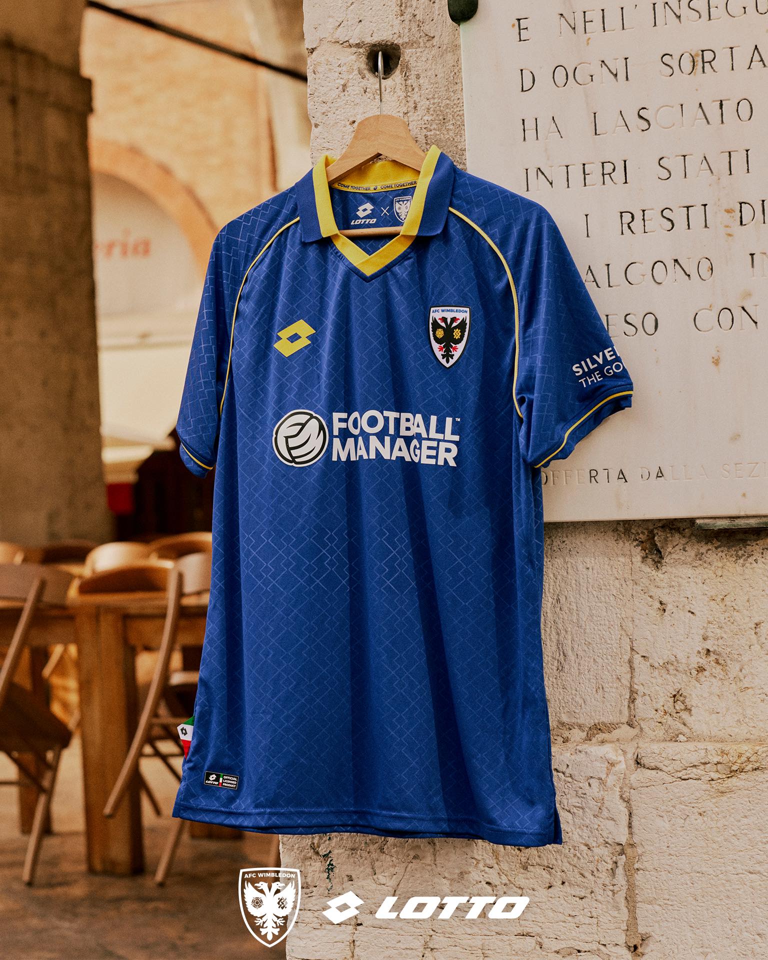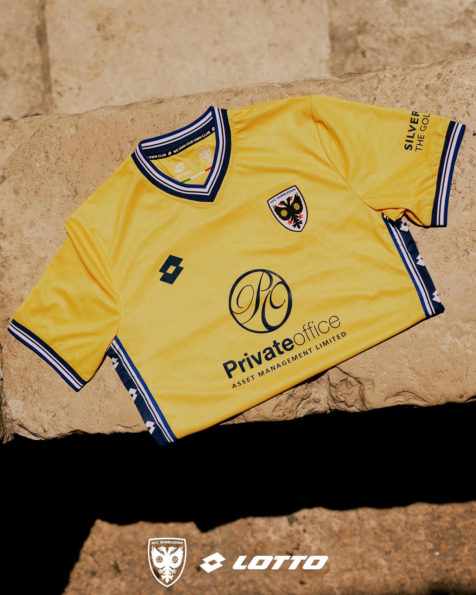 The Football Manager logo appears as the main sponsor on the home shirt, while War Child features on the away kit. The third kit is sponsored by Private Office. Lotto’s branding is placed on the chest and sleeves, with the AFC Wimbledon crest displayed on each shirt. Silverman’s logo is seen on the sleeve, while the shirts include Lotto’s signature collar and trim details.
