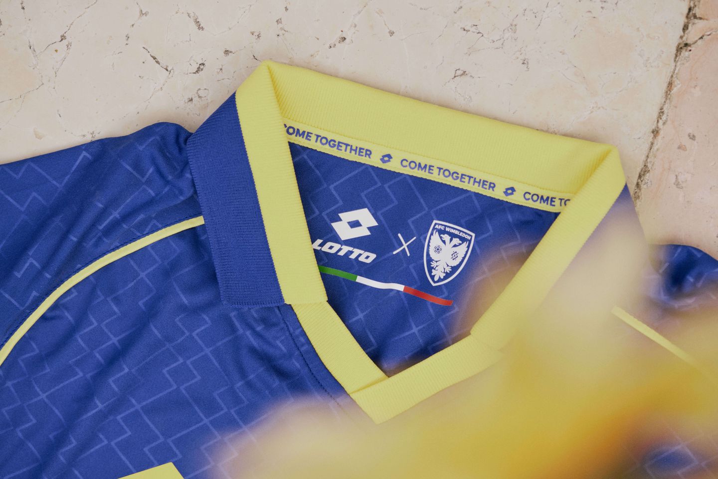 The home shirt is royal blue with yellow trim and features a subtle embossed Lotto diamond pattern across the fabric. The away shirt uses black and green hoops, colours linked to the club’s history with Wimbledon Old Centrals, with the design taking inspiration from Lotto’s Stadio II boot. The third shirt is yellow with navy and white detailing, reintroducing a colour not seen in an AFC Wimbledon outfield kit since 2021.