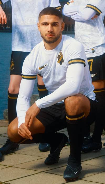 This tribute to the locality, which was unveiled gradually via a mural and debuted today, also boasts gold-and-navy trim - matching the crest - and a retro Nike logo and forms a kit with navy shorts and socks.