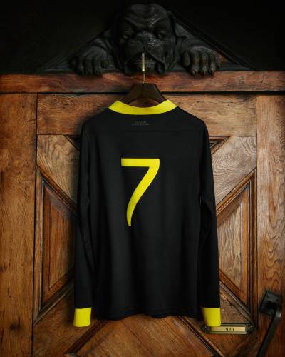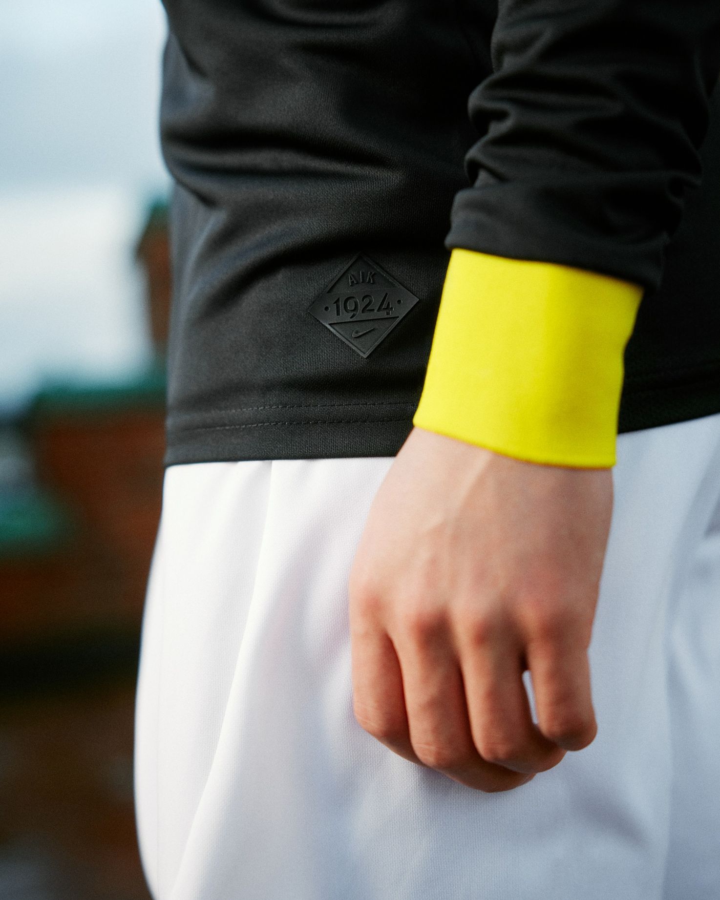 The overlapping-V neck and cuffs and the front-and-centre initialism contrast in yellow, while the Nike branding is non-contrast and this is repeated on the white shorts that complete the cup kit with the black-and-yellow socks.