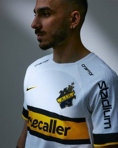 The 2024 design for the Solna, Stockholm-based Swedish Allsvenskan side is decorated with a black-and-yellow stripe across the trunk and this palette is echoed in the cuffs and the US supplier’s Swoosh.