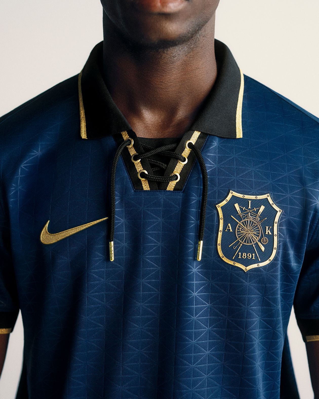 The AIK Cup Kit is presented in dark blue with gold detailing. The front features the club’s first ever crest, originally used between 1891 and 1898, reproduced in dark blue and gold in line with the only known historical colour reference. A tonal embossed pattern runs across the fabric, inspired by the facade of the National Arena. The Nike Swoosh appears in gold on the chest.