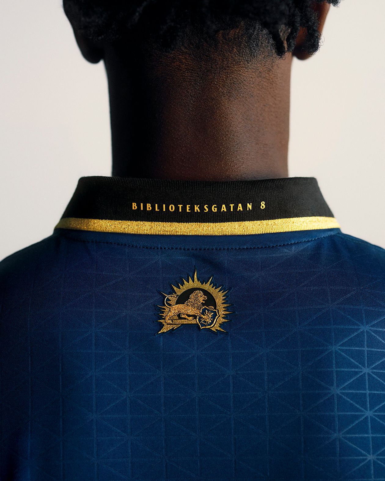 A defining element of the AIK Överallt Edition shirt is the lace up collar, referencing both early 20th century AIK football shirts and the club’s 1999 European campaign kit. The eyelets carry the wording Allmänna Idrottsklubben, while the metal lace tips are marked AIK. At the back of the neck, a historical lion illustration is positioned alongside a reference to Biblioteksgatan 8, the club’s founding address. Player numbers on the reverse are finished in silk and three dimensional silicone with gold metallic detailing.