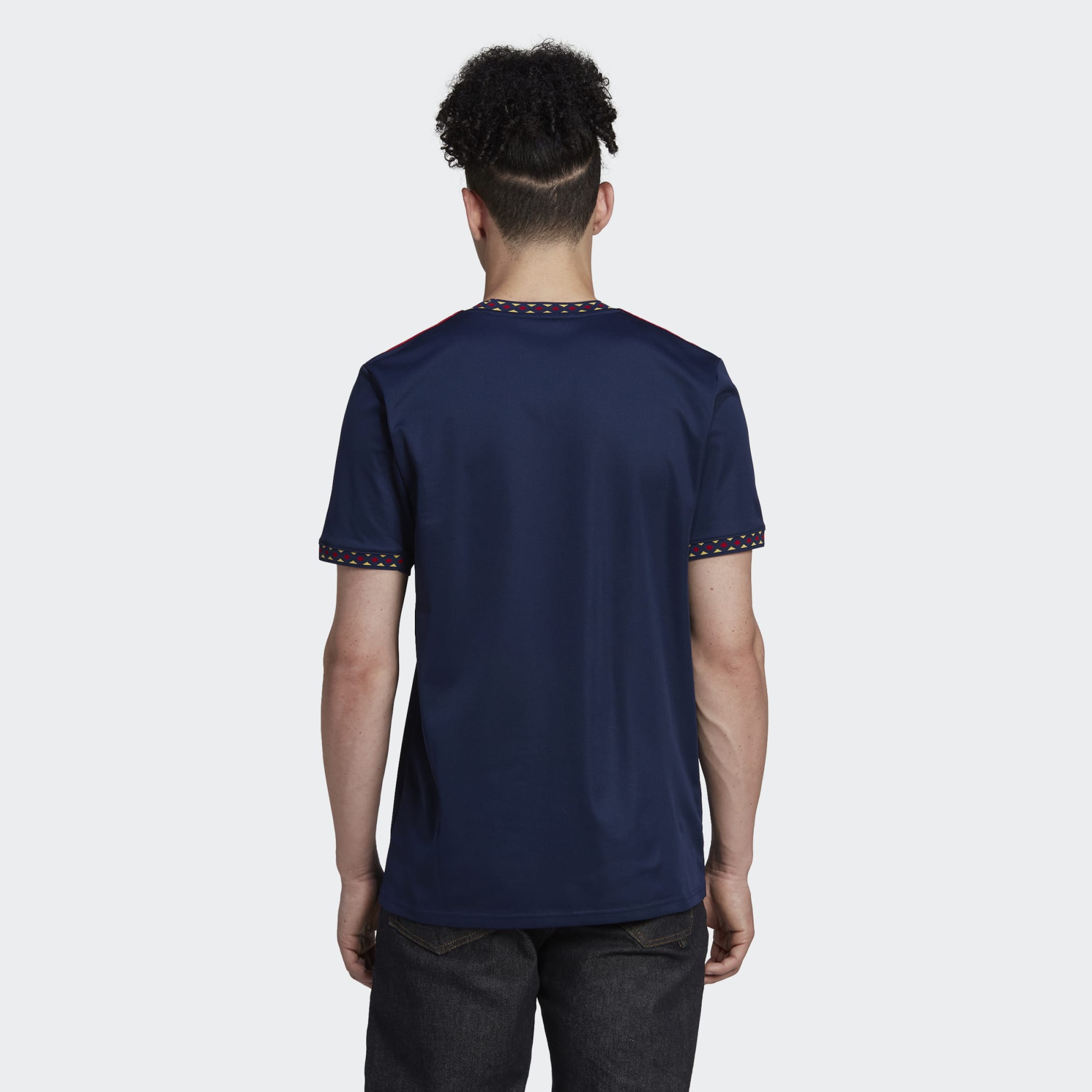 The club logo, the various sponsor logos and the back print are gold. Red is incorporated through the three champions stars on the chest and the adidas stripes on the shoulders.