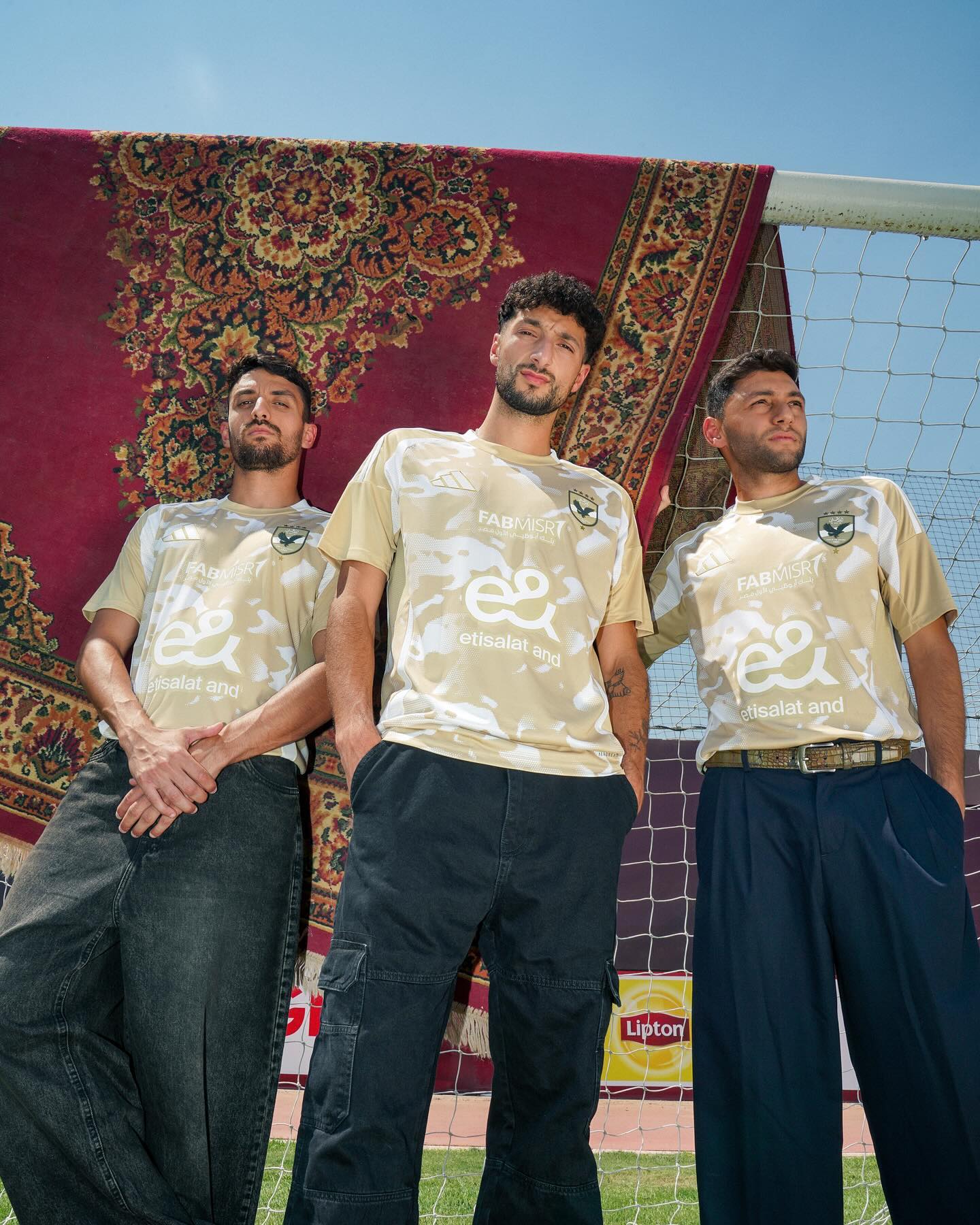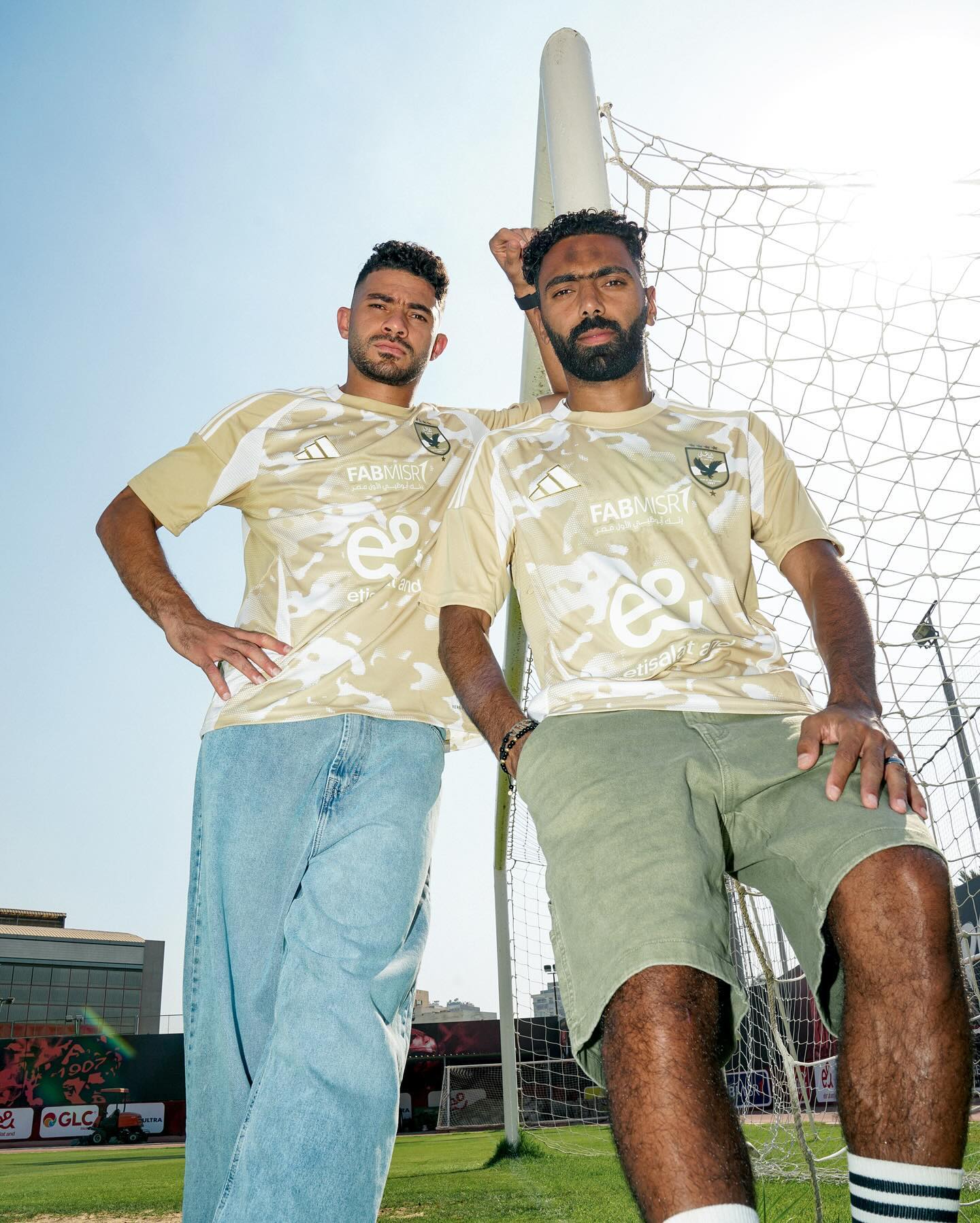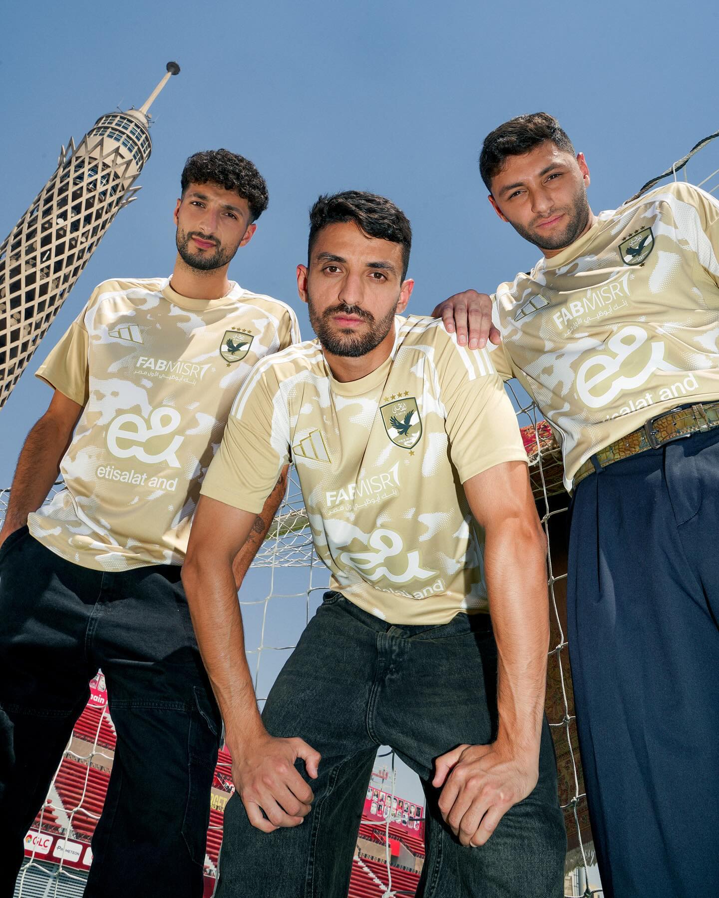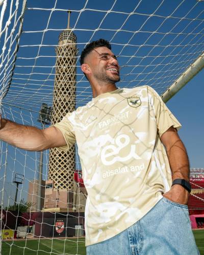 The kit showcases a sand-inspired camouflage design that celebrates the beauty of Egyptian dunes. It comes in a warm beige tone with white sponsor logos, supplier branding, and a monochrome Al Ahly crest in a subdued style to complement the overall colour scheme.