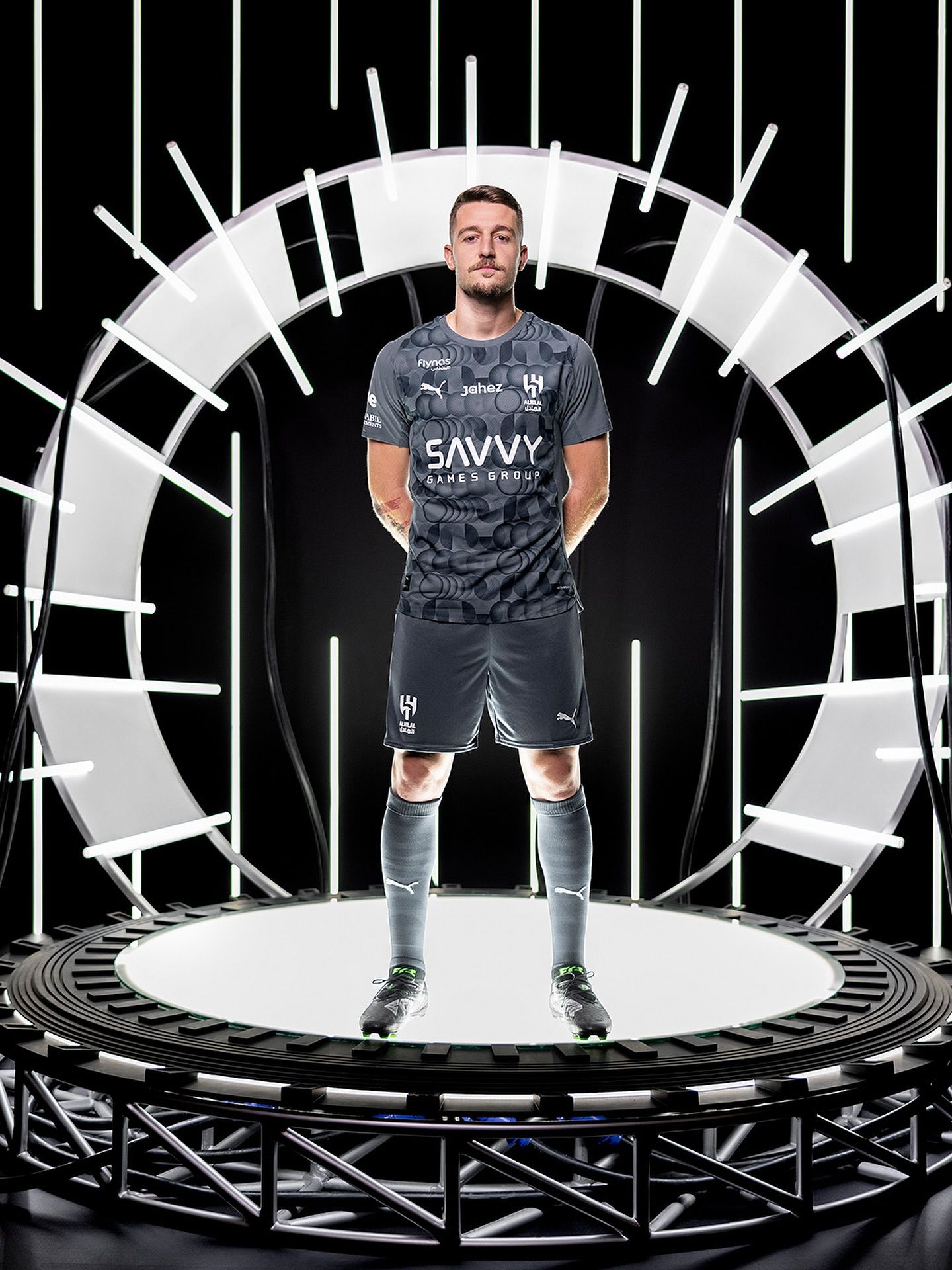The shirt comes in a Dark Teal (Gray Skies) tone with a circular textured pattern across the front and sleeves in Silver Mist. The design references the crescent moon, a central symbol for the club, aligning with the Al Hilal name and crest. Puma’s logo appears on the chest and sleeves, with the club badge and the Savvy Games Group sponsor placed prominently on the front. Additional sponsor marks include Jahez on the chest, Riyad Bank across the back, and Seven at the base of the shirt.