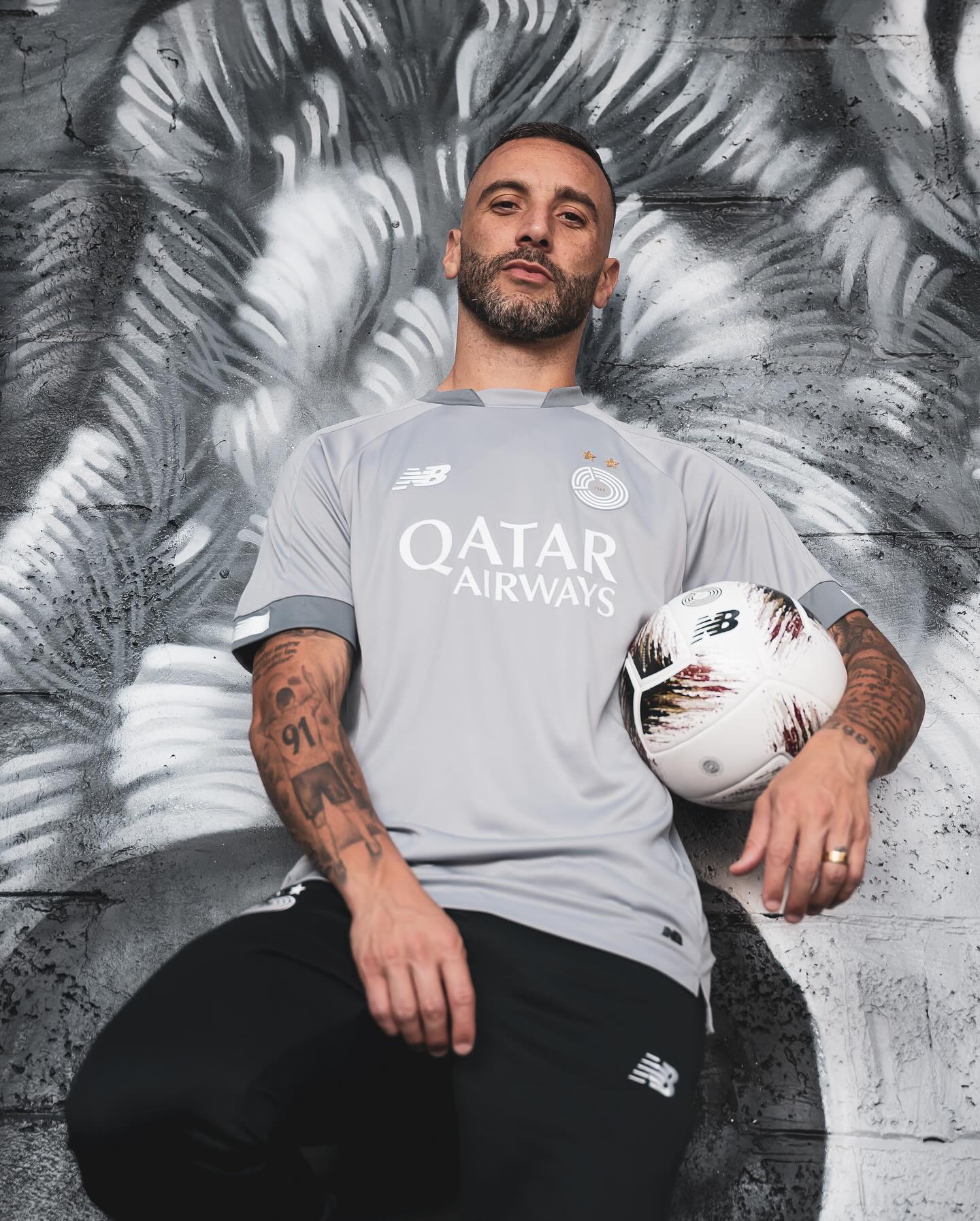 New Balance's logo appears on the right chest, with Qatar Airways emblazoned across the front. The club's badge is embellished with two gold stars above, signifying past glories.