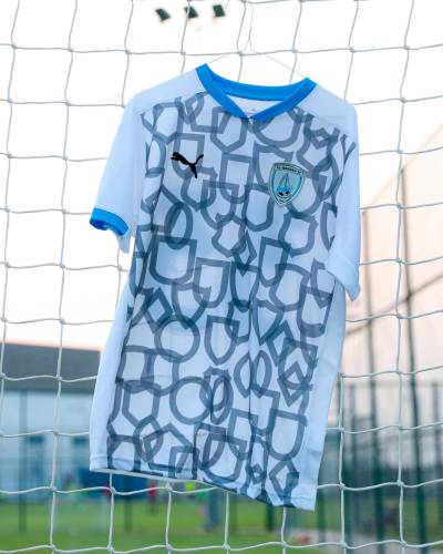 The new Puma design sees crest shield outlines providing a pattern to the otherwise white trunk and the neck and cuffs are in light blue.