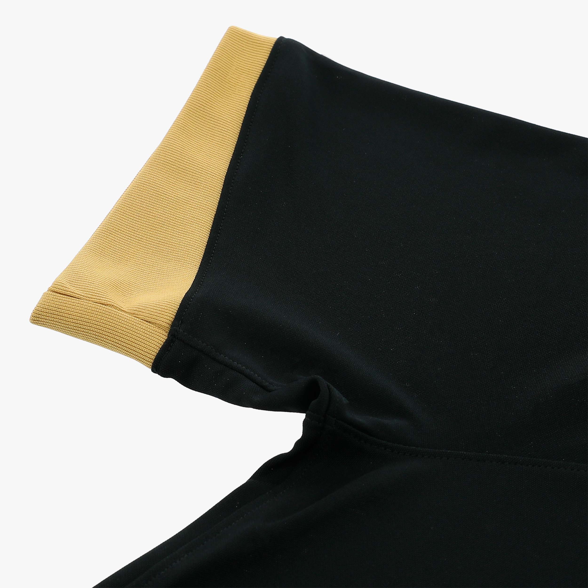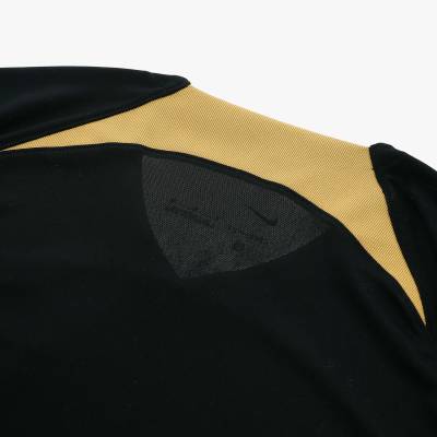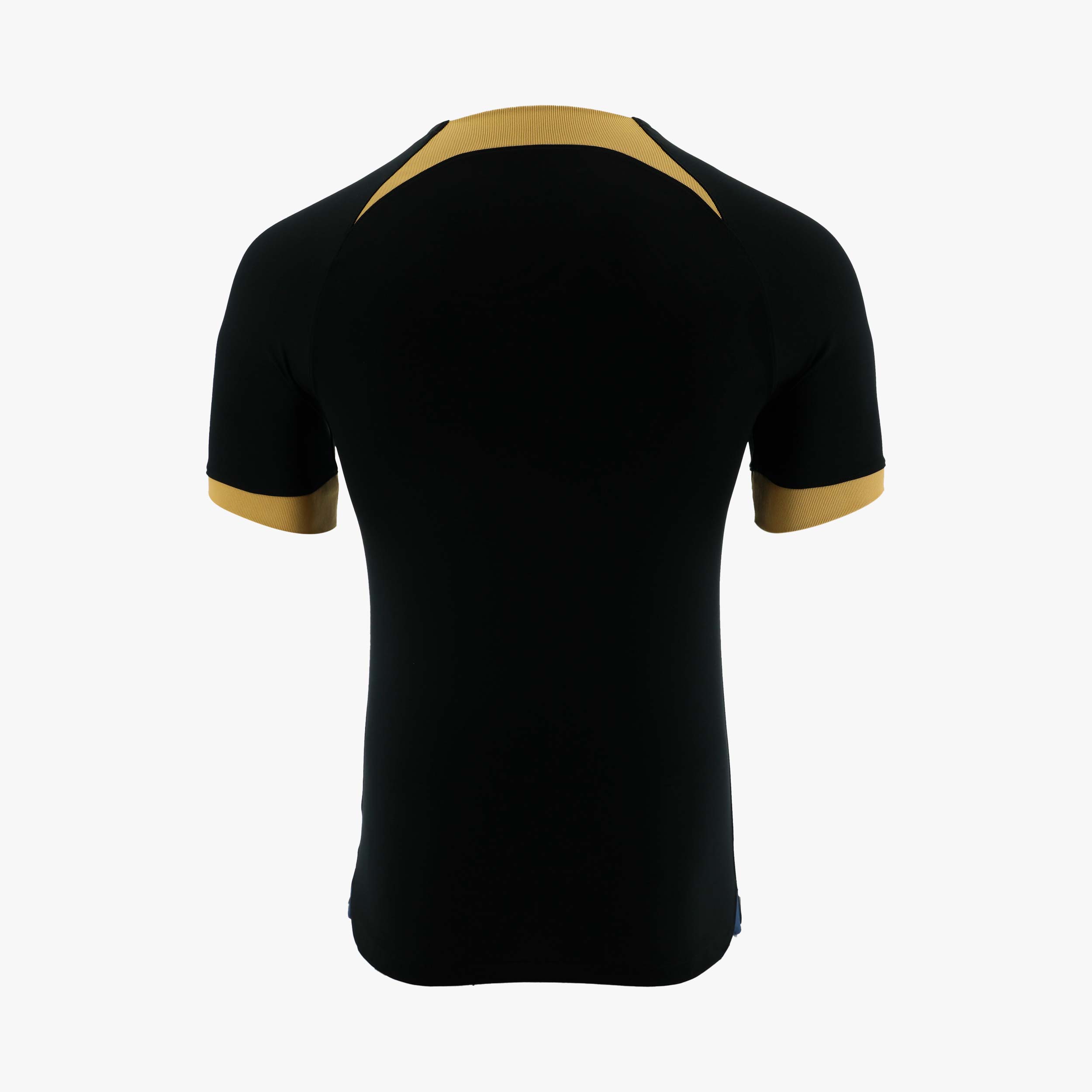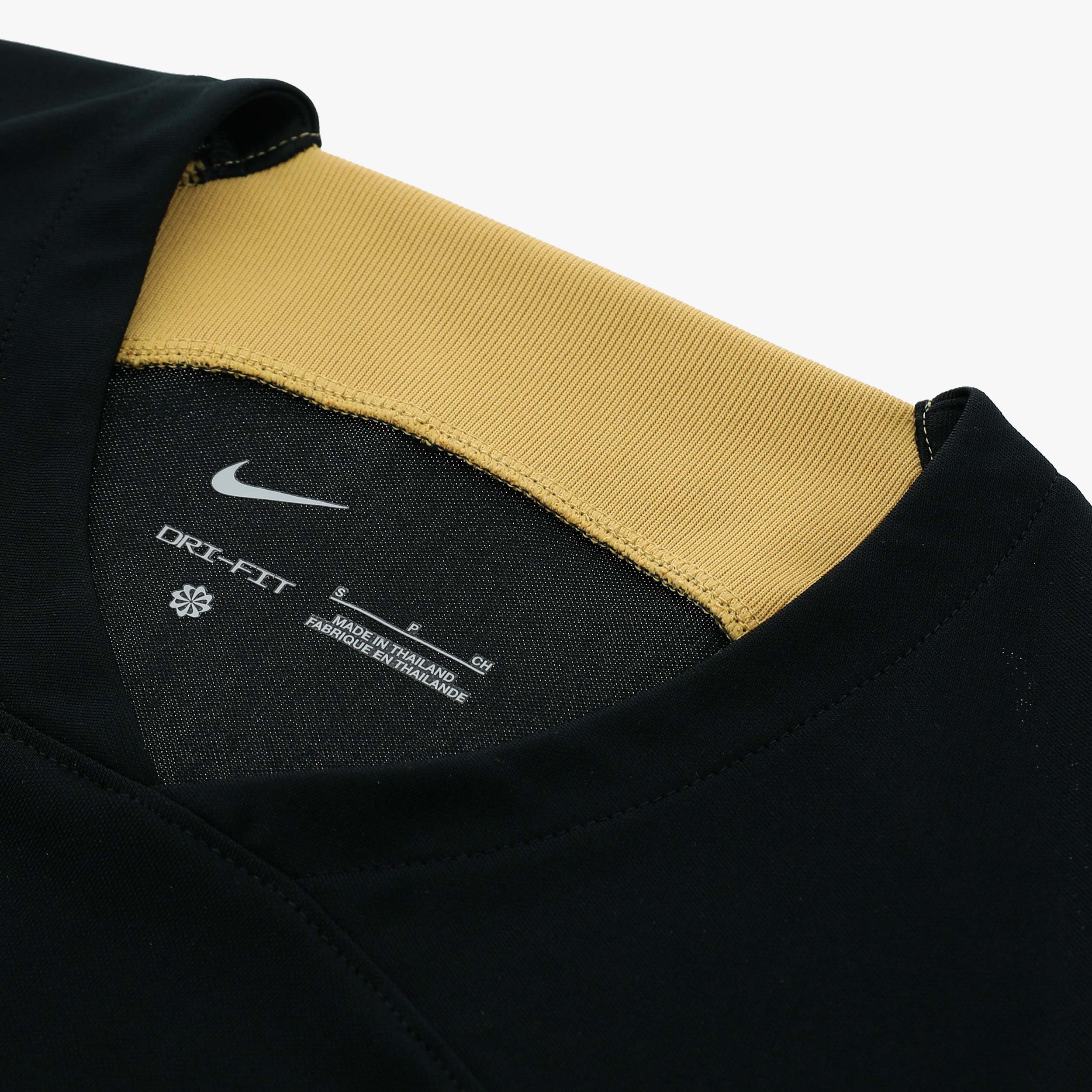 The new Nike release is in black with gold accents and the famous navy and white appear only in the Swoosh logo (the latter), inserts at the hem (the former) and crest (both). The kit is completed with matching black shorts and socks.