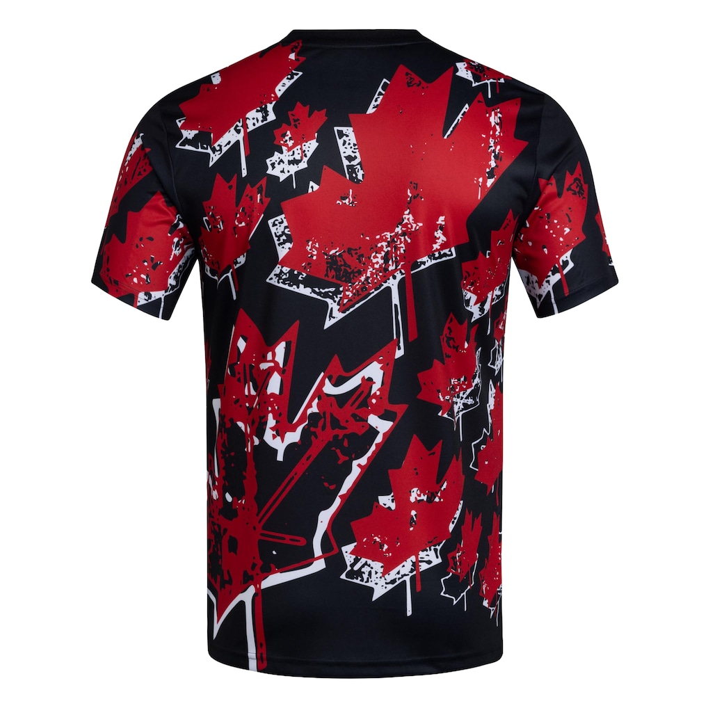 The Canadiana pre-match shirt uses a black base with a repeated maple leaf pattern in red and white. The leaf graphics are distributed across the full surface of the jersey, including the sleeves and reverse. As with the Americana version, the shirt includes a heat-applied club crest and sponsor branding on the front, alongside an adidas logo.