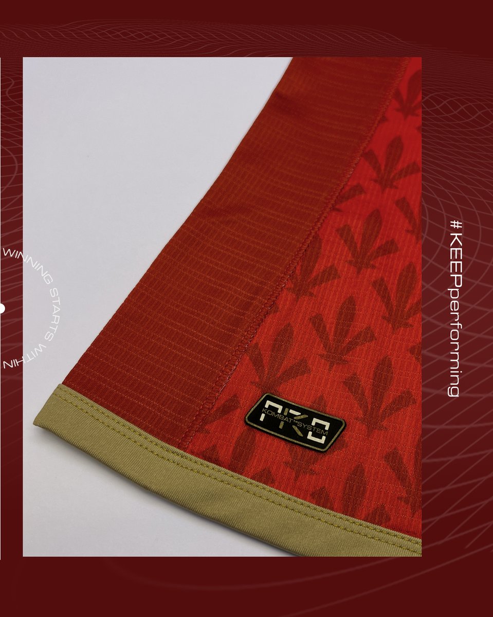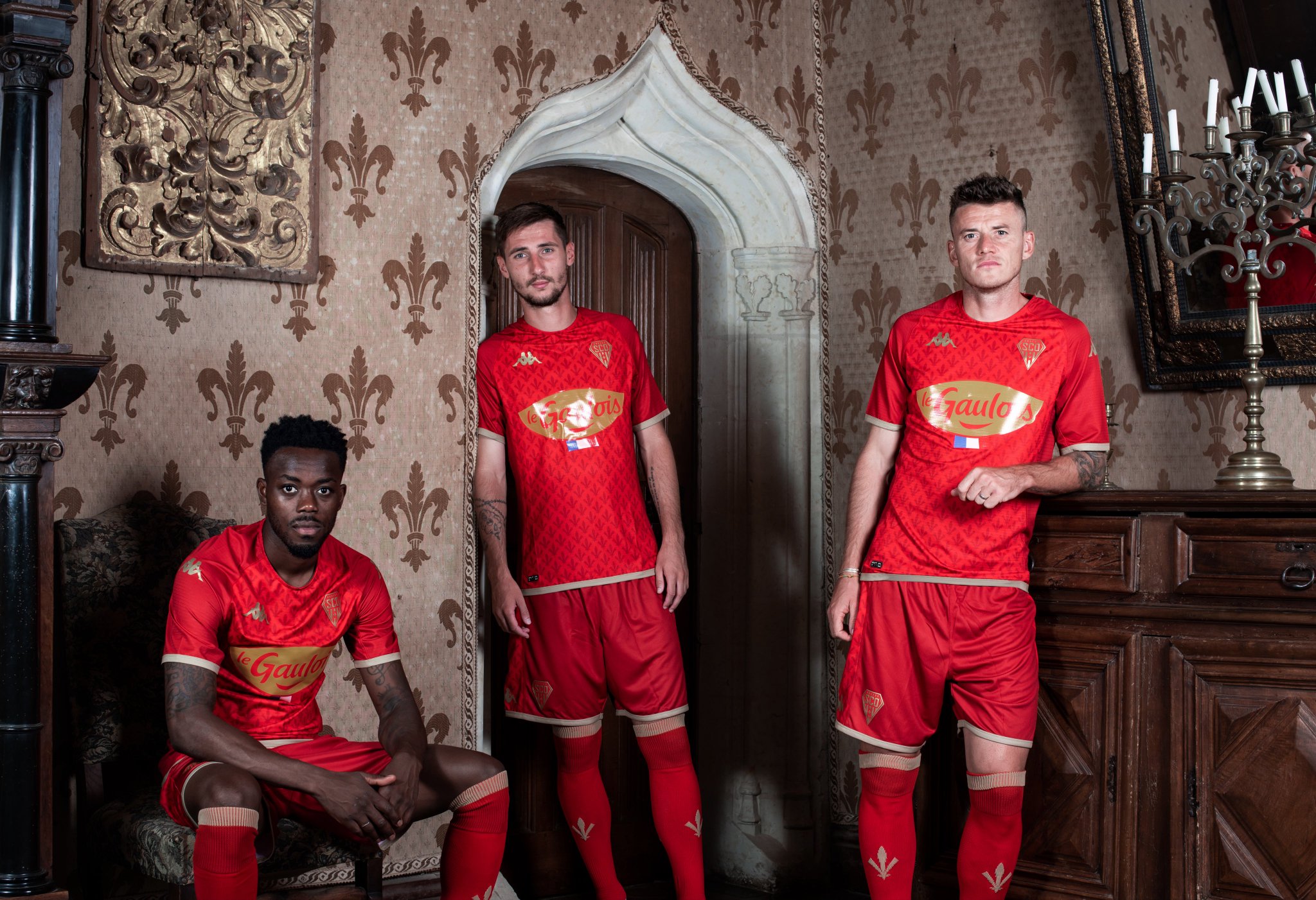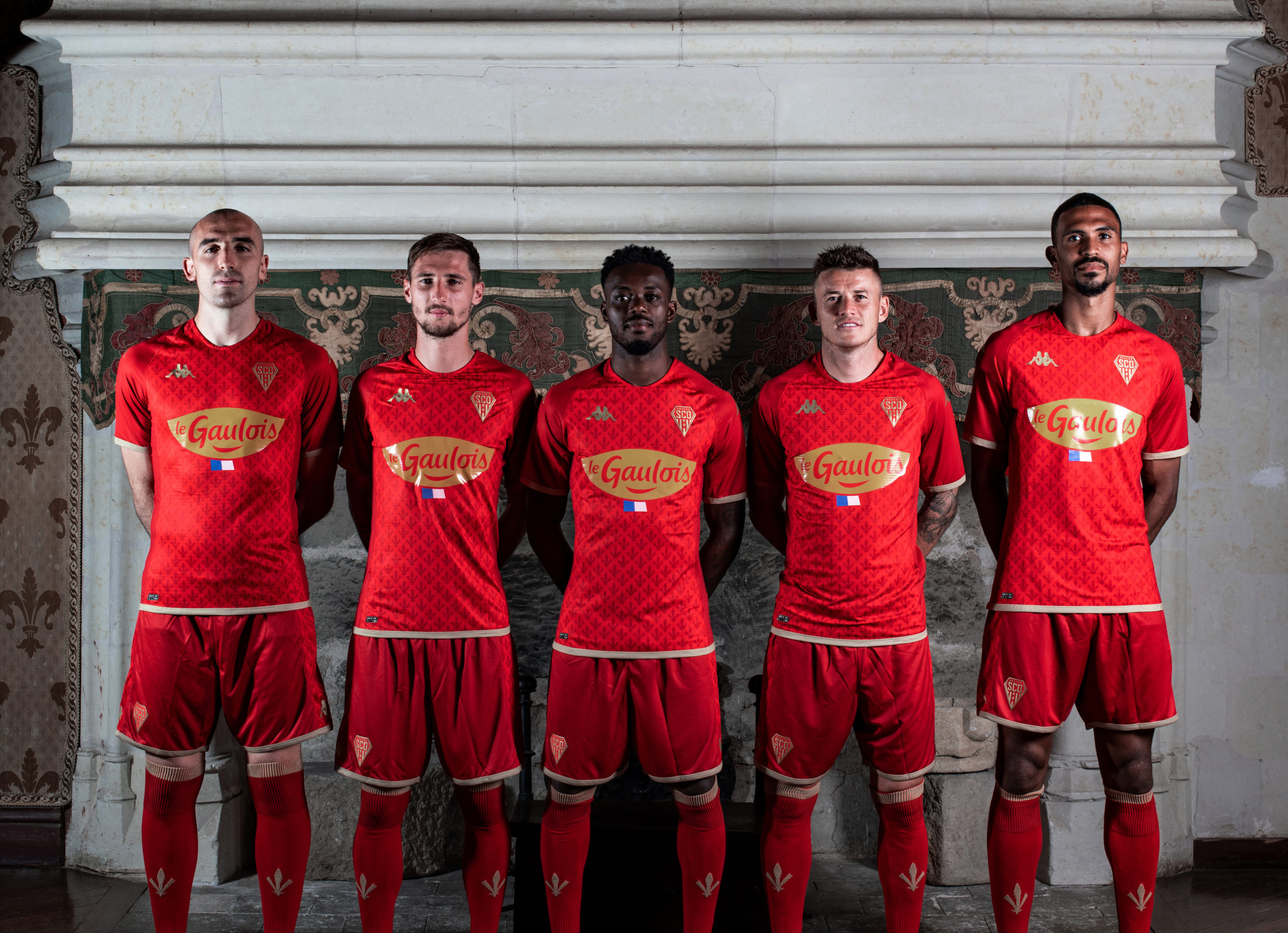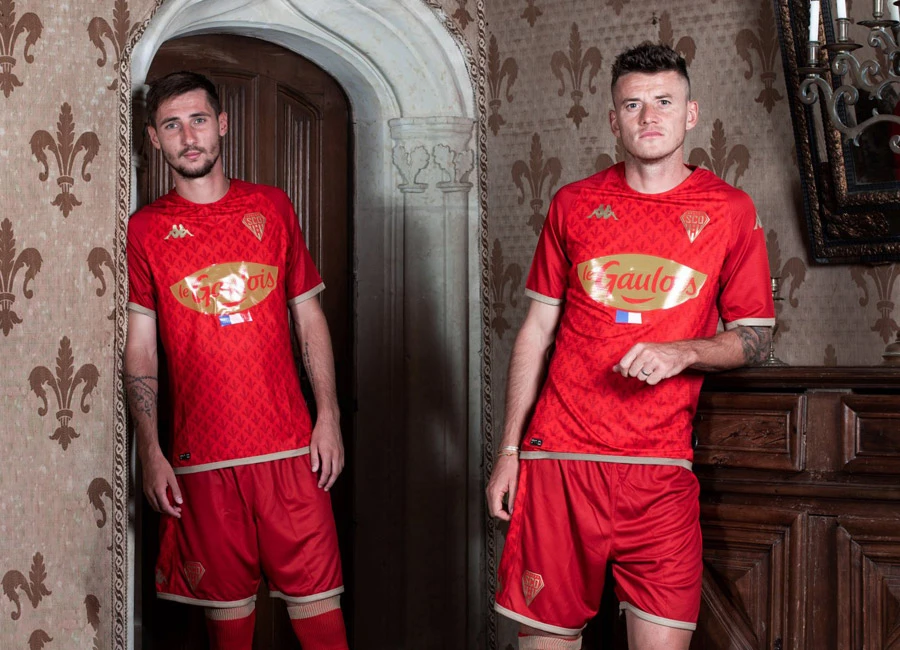 Almost all embellishment is in gold, including the trim, the supplier’s “Omini” logos, the detailing on the crest and most of the main sponsor logo - which adds blue and white to the palette via its incorporation of a French Tricolore flag. The kit is completed with red shorts and socks.