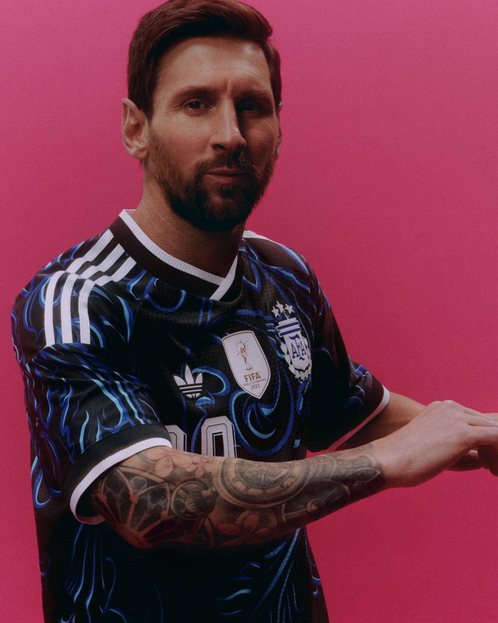 White accents are applied throughout the shirt, including the adidas three stripes on the shoulders and trim on the collar and sleeve cuffs. The Argentina Football Association crest appears on the left chest in a monochrome execution, while the adidas trefoil sits opposite. A central FIFA Champions Badge is positioned between the two, reflecting Argentina’s status on the international stage.