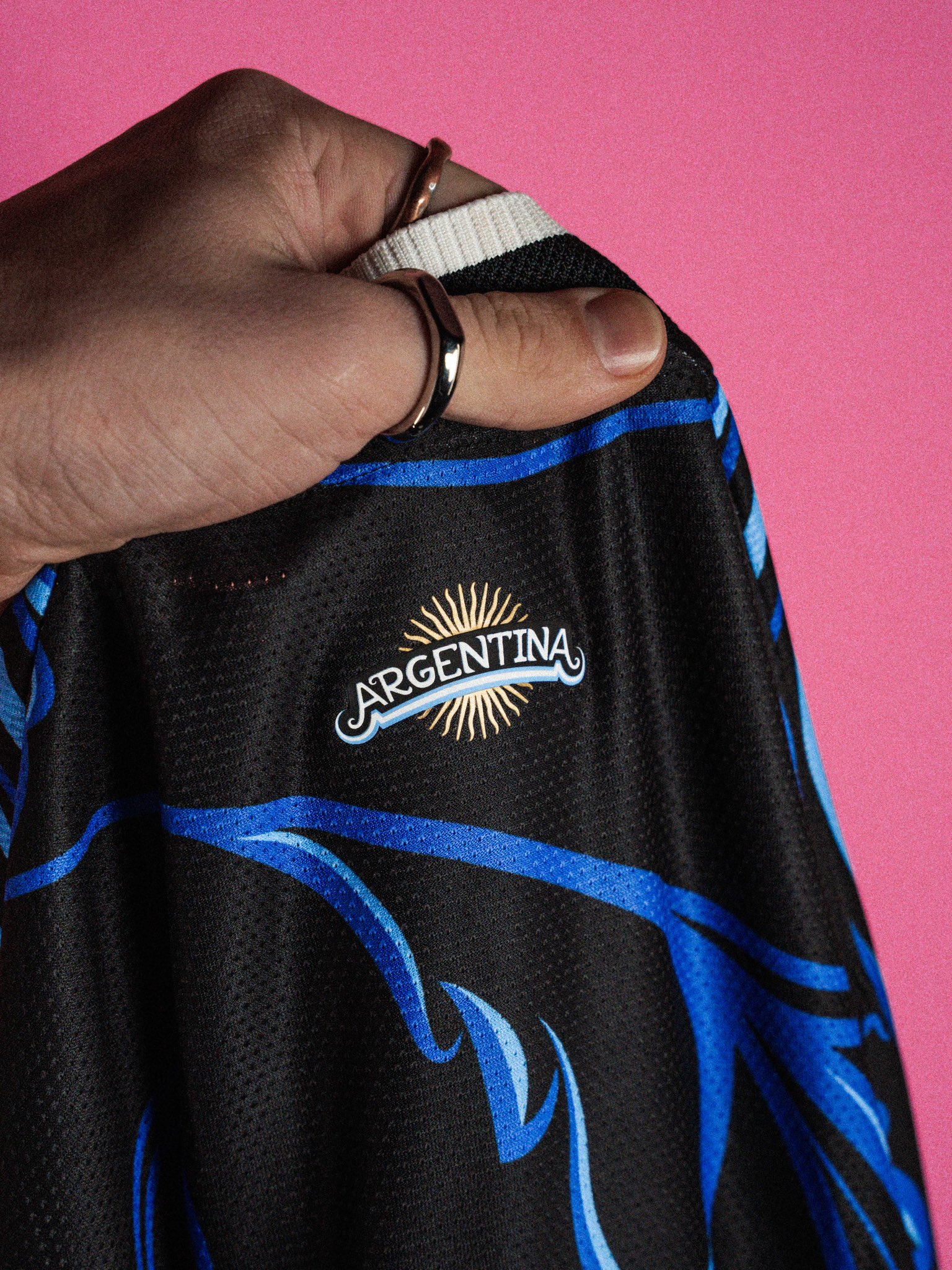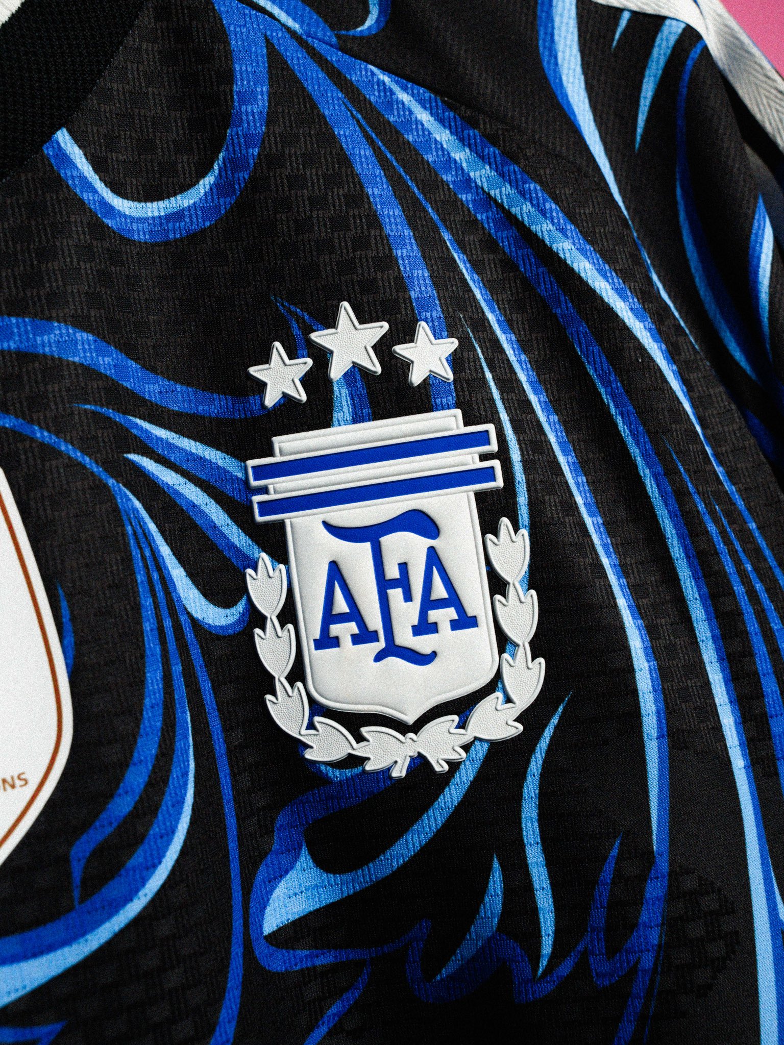 The new Argentina jersey features a black base combined with an all-over Lucid Blue and Blue Burst graphic pattern of floral swirls and climbing plants. The surface is covered in flowing, ornamental shapes that reference traditional Argentine motifs, forming a continuous design across the front, back and sleeves. The detailing is executed in varying shades of blue, creating contrast against the darker foundation.