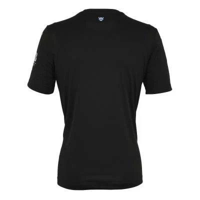 The club crest is in full-coloured, standard form, while there is a colour-converted shield from the city coat of arms on the upper back and the kit was completed with matching black shorts and socks in the DFB Pokal defeat to VfB Stuttgart.