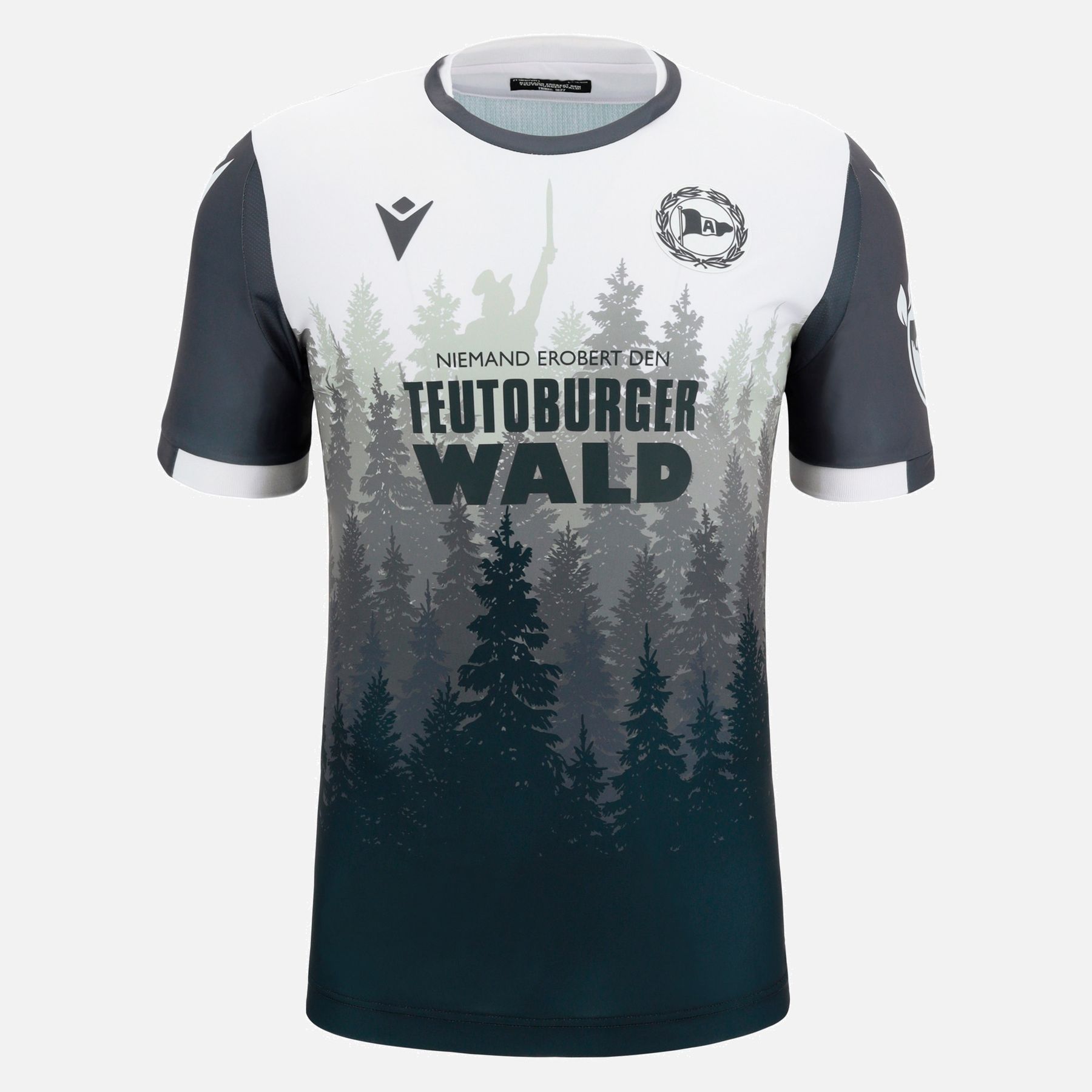 The jersey has a V-neck edged in grey. At chest height, the jersey is white with the Macron Hero - logo of the Italian brand - on the right in a silicon print and the Arminia Bielefeld crest on the left, heart-side. On the front, the jersey is characterised by a graphic that blurs from light grey to anthracite grey. The design features the Teutoburg Forest with an image of the Hermansdenkmal, the Arminio Monument located in Detmold, in the southern part of the forest. The external backneck is personalised with the motto NIEMAND EROBERT DEN TEUTOBURGER WALD on a black background. The coat of arms of the city of Bielefeld is embroidered in black and white on the internal backneck.