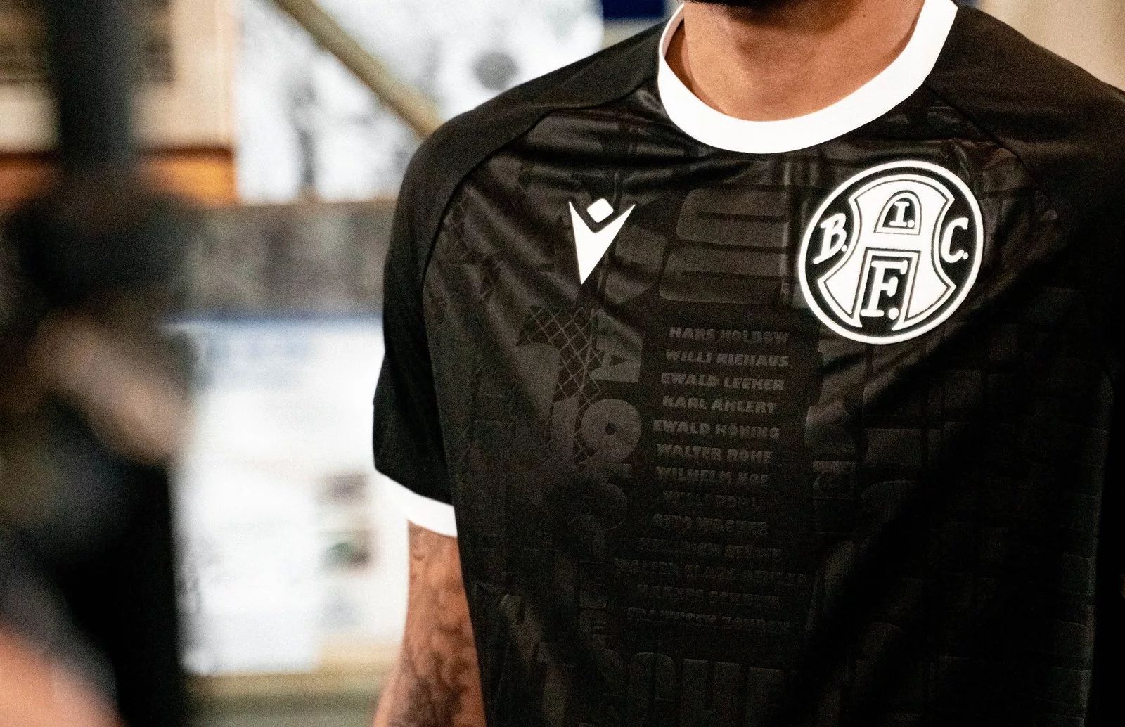 The black Macron jersey, featuring the historic Arminia logo, bears the names of the players from the championship-winning team on its chest.
