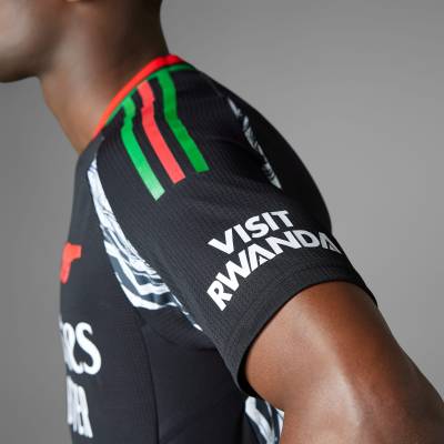 This design celebrates Arsenal's connection to their African supporters, drawing inspiration from the continent's design traditions. The shirt features traditional pan-African colours of black, red, and green, with a striking white zig-zag graphic designed by Labrum London founder Foday Dumbuya.