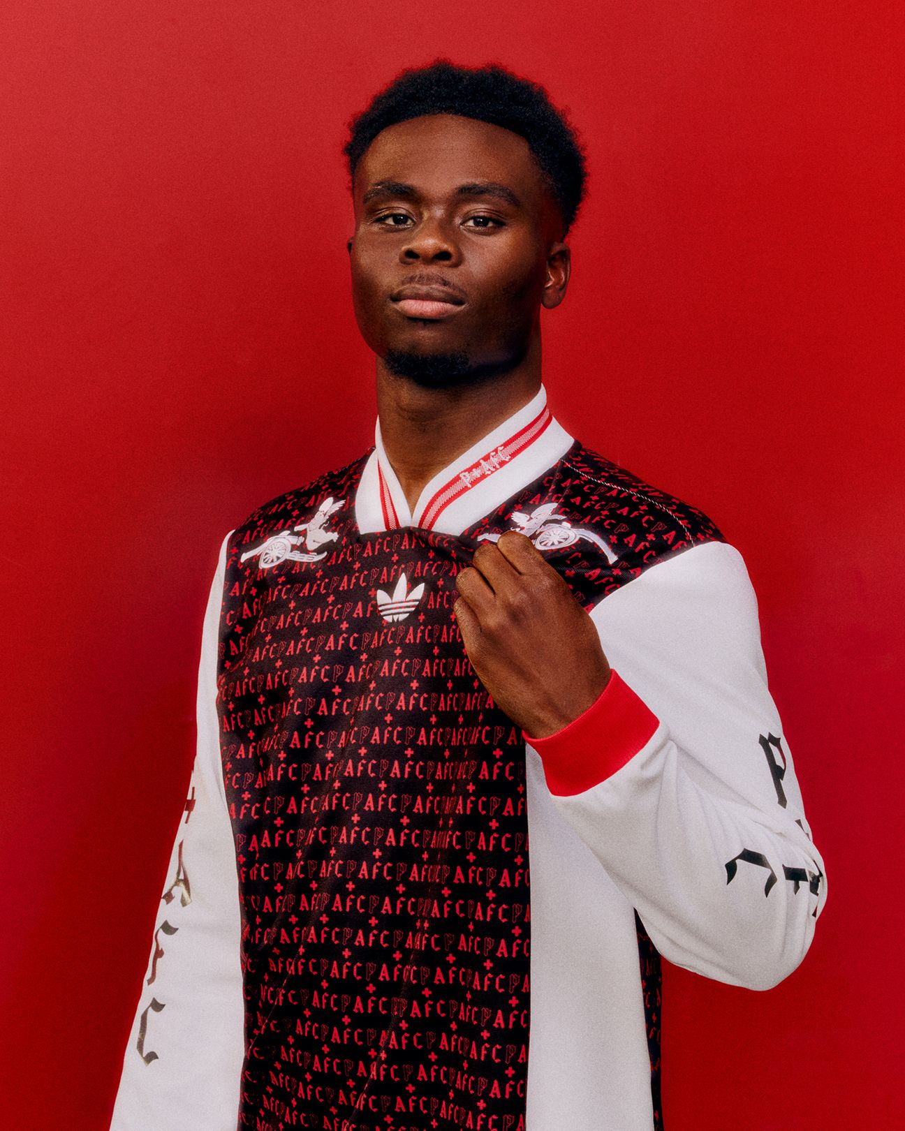 On the chest, the white adidas Trefoil logo sits centrally, flanked by two white Arsenal cannon graphics positioned on either side. The collar is a ribbed V shape in white with red striping and includes “P + A F C” text integrated into the knitted detailing.