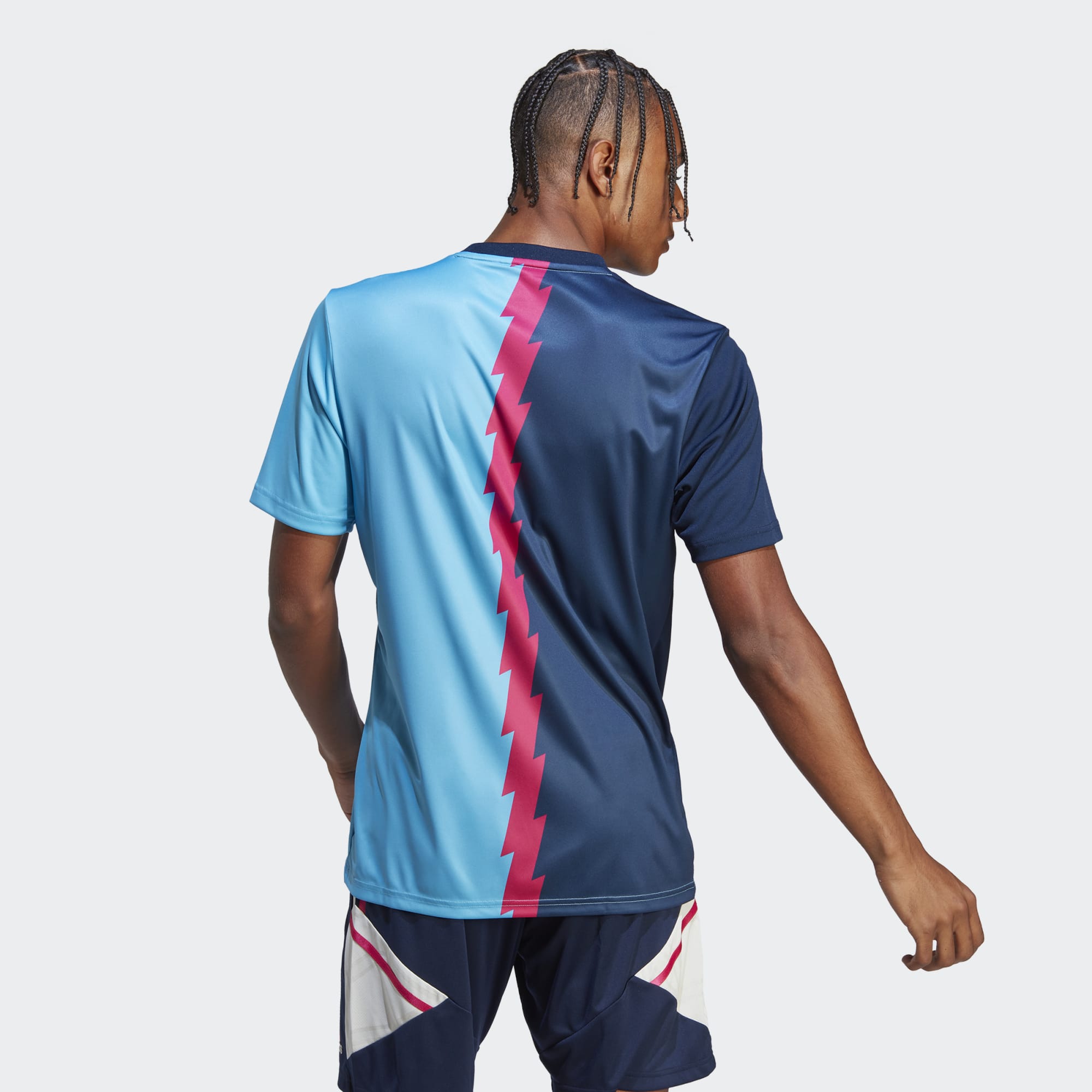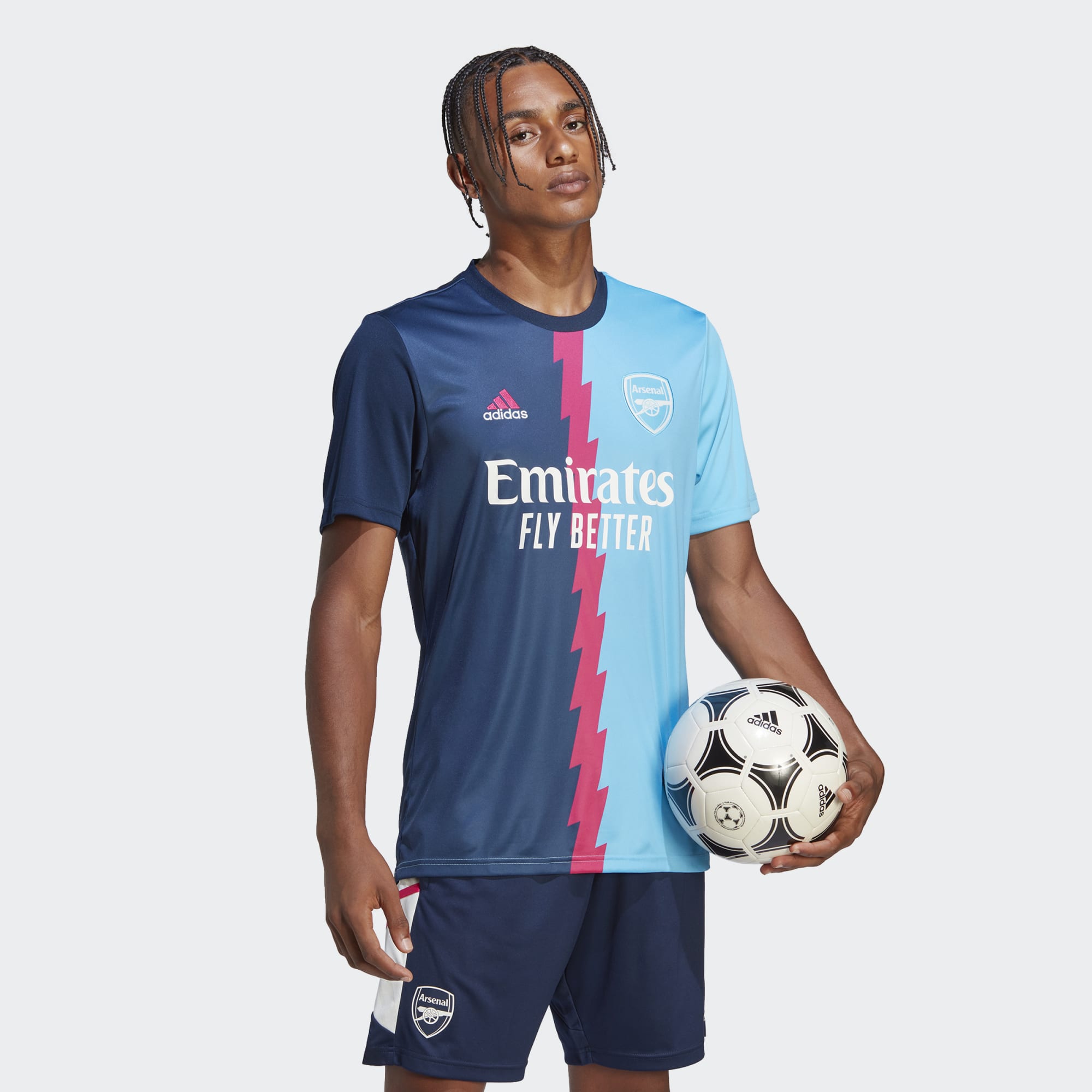 Based on the shirts worn by the Gunners in the 95/96 season, this Arsenal Pre-Match Jersey in Collegiate Navy/Team Real Magenta/Sky Rush is worn by the players when they're preparing for kickoff.