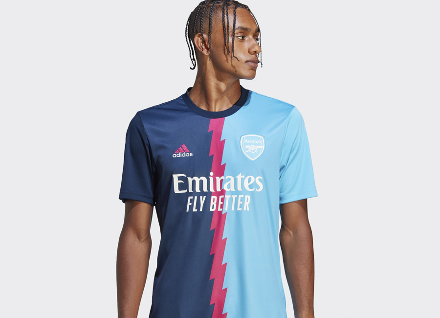 Based on the shirts worn by the Gunners in the 95/96 season, this Arsenal Pre-Match Jersey in Collegiate Navy/Team Real Magenta/Sky Rush is worn by the players when they're preparing for kickoff.