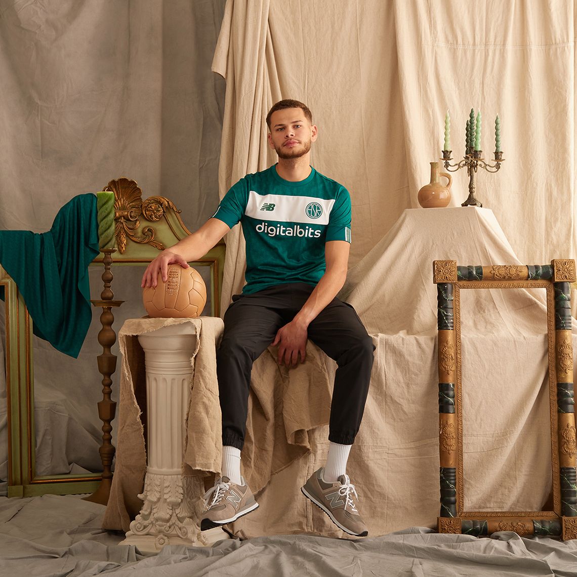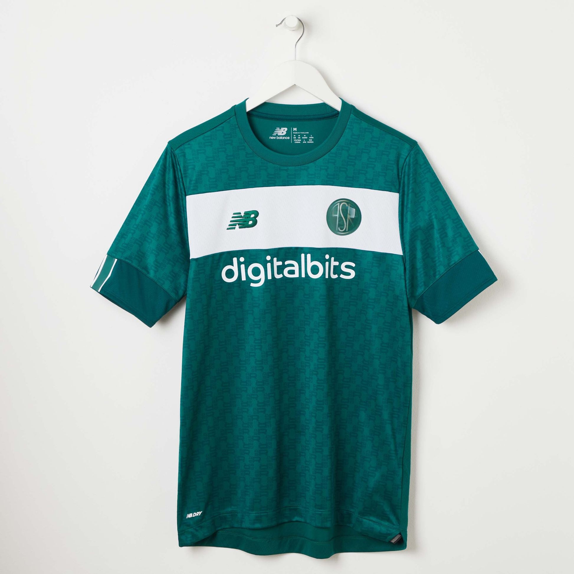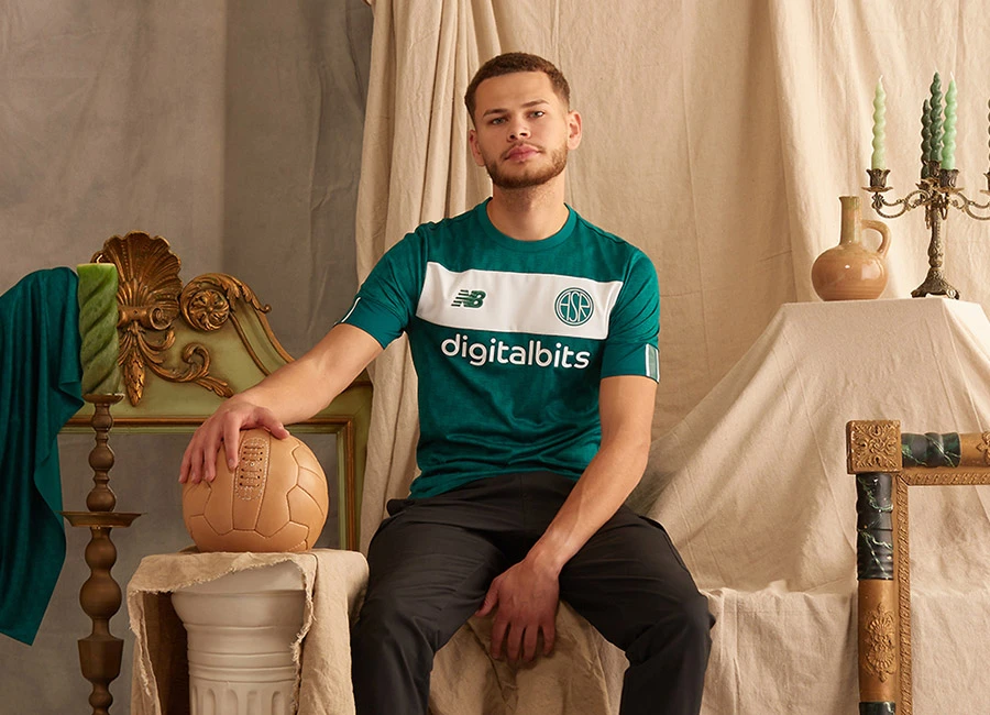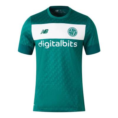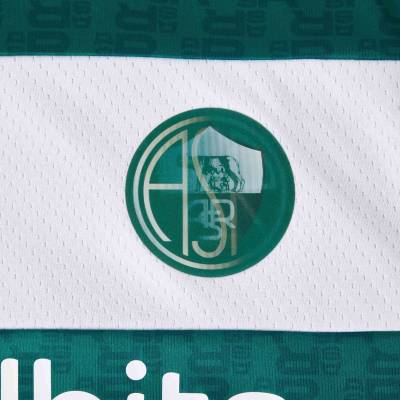 The kit features a green base with a white horizontal stripe across the chest and an ASR monogram pattern covering the entire jersey. The contemporary design combines with details recalling the club's heritage, such as the logo used from 1933, creating a unique jersey that complements any outfit, matching the current football & fashion trend.