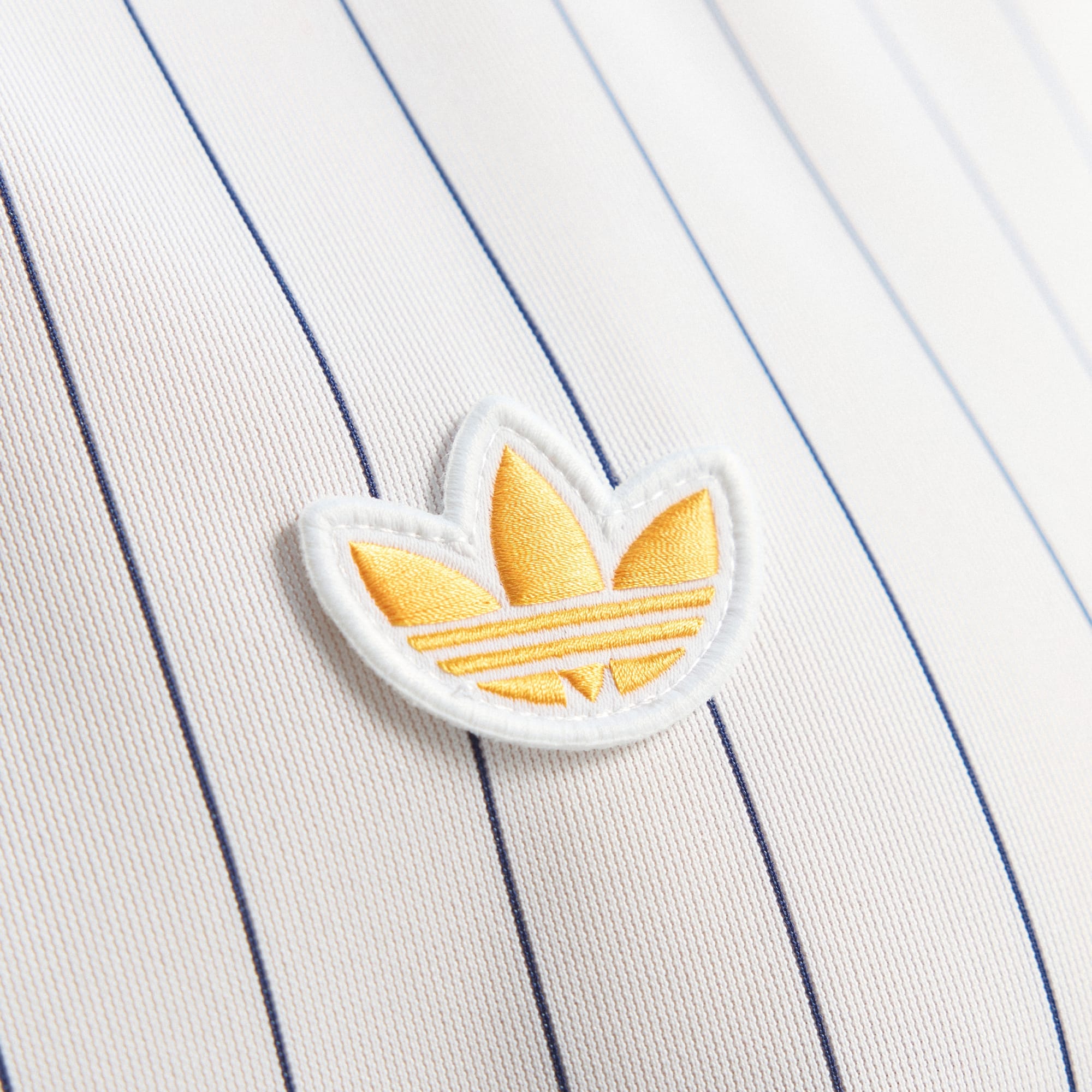 The jersey features a white base with fine navy pinstripes and a navy collar. Red and yellow adidas shoulder stripes add contrast, while the club’s 1980s wolf head badge appears embroidered on the chest. The Trefoil logo sits opposite, nodding to the heritage of the adidas Originals range.