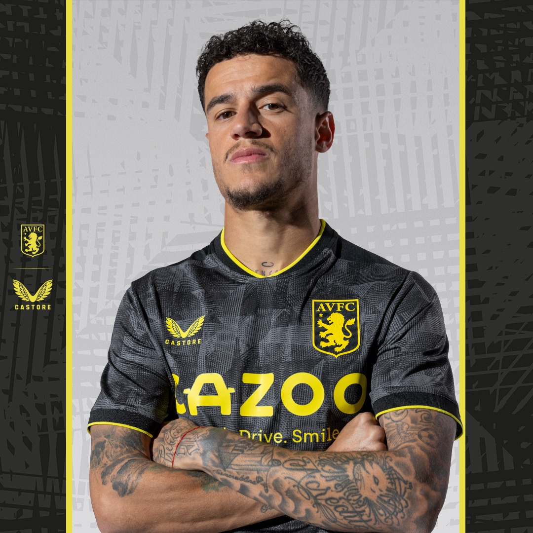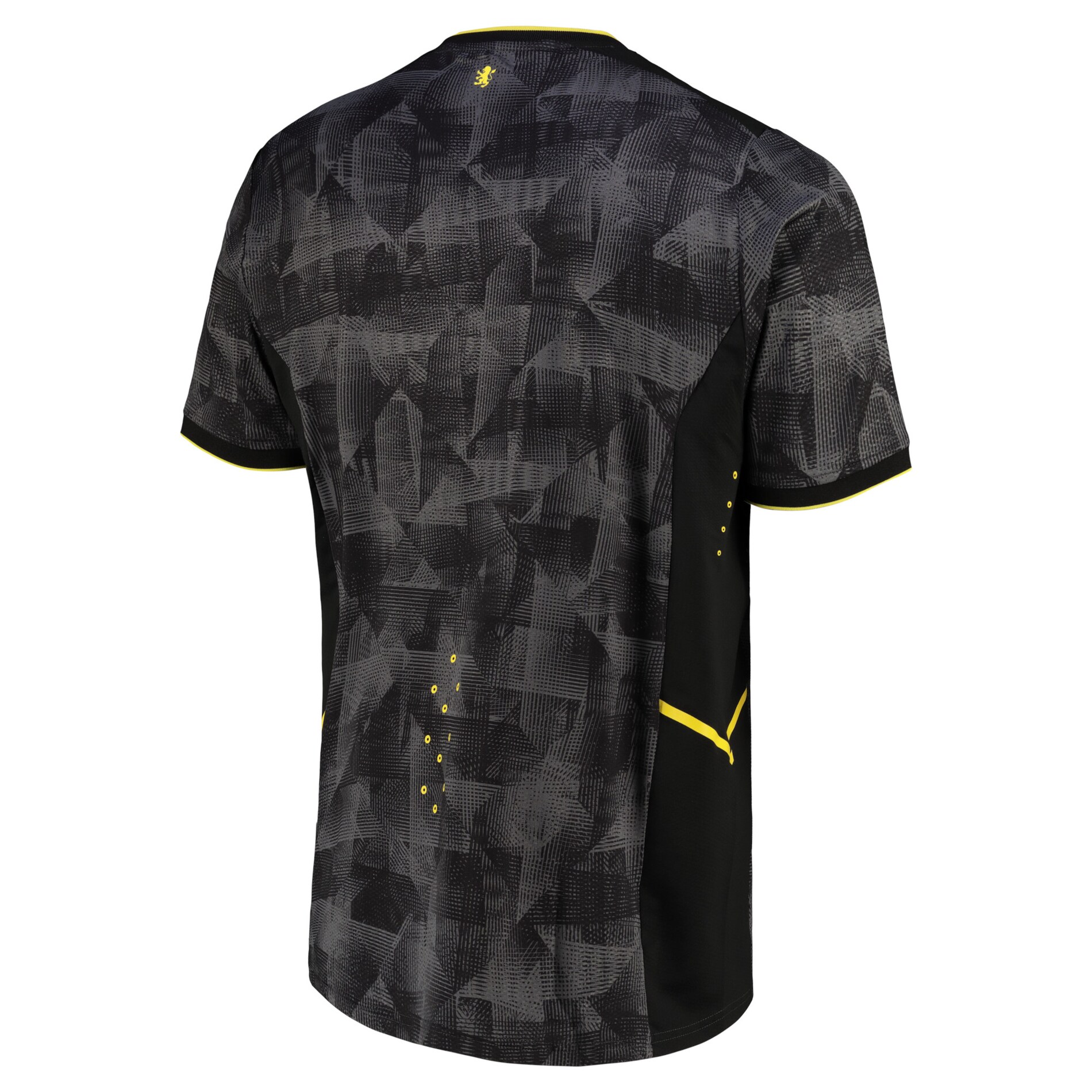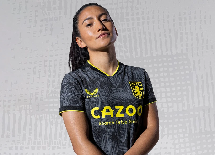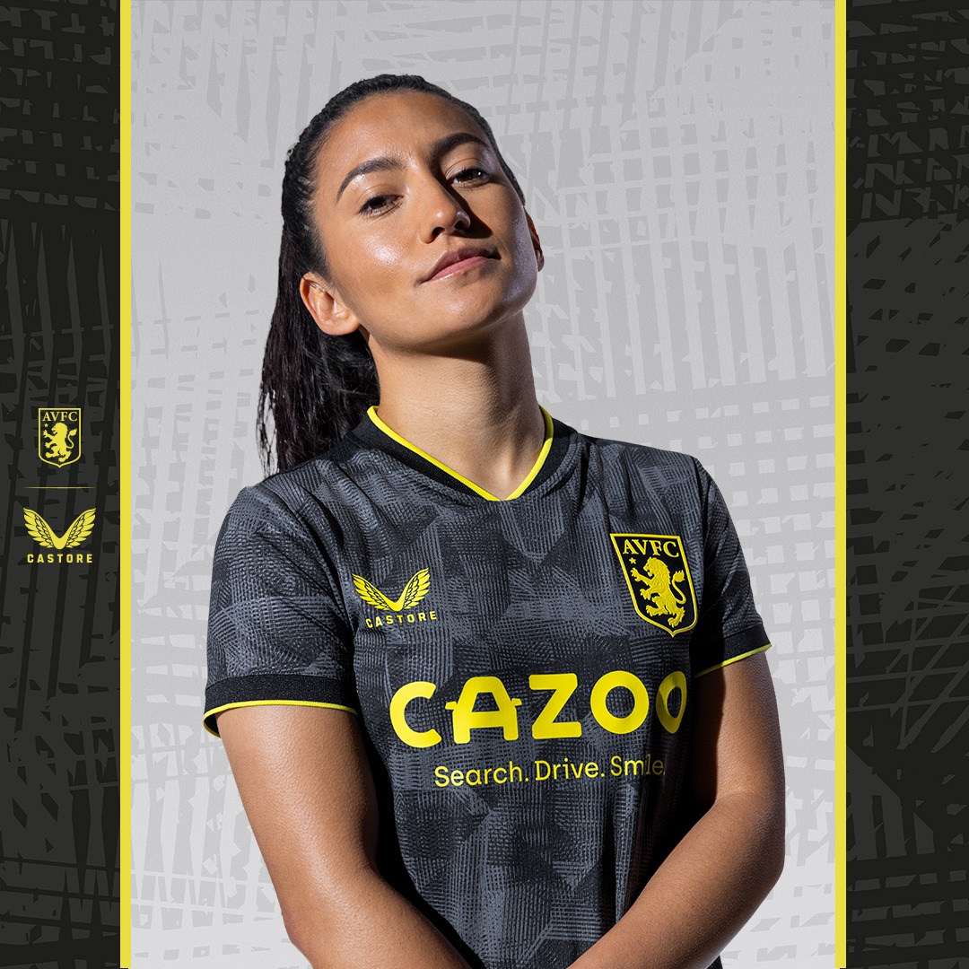 Villa’s 2022/23 Castore third kit displays a dynamic graphic on a rich black base with punches of blazing yellow to present an electrifying look.