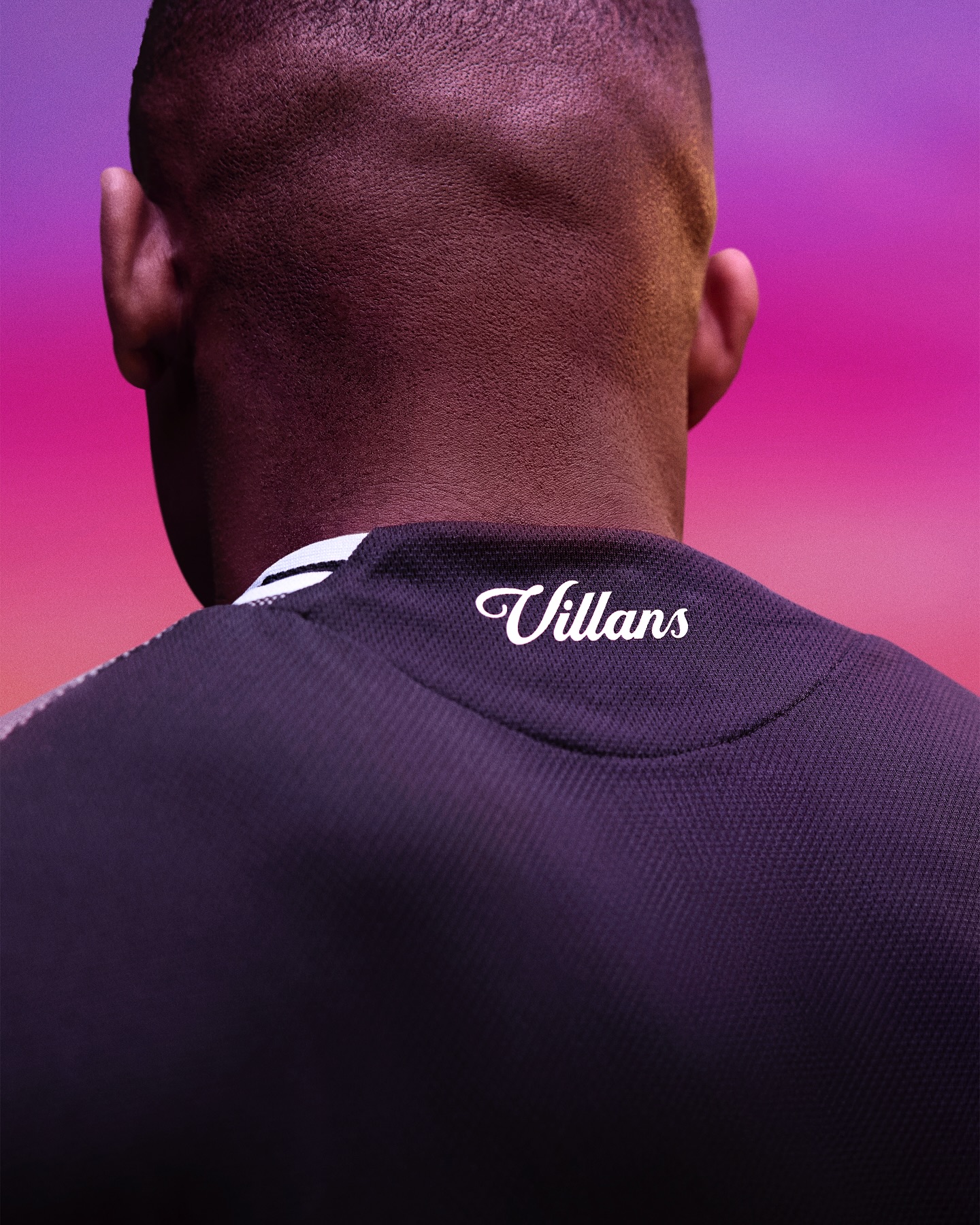 The shirt also includes a white “Villans” sign-off printed on the upper back and is paired with black shorts and black socks.