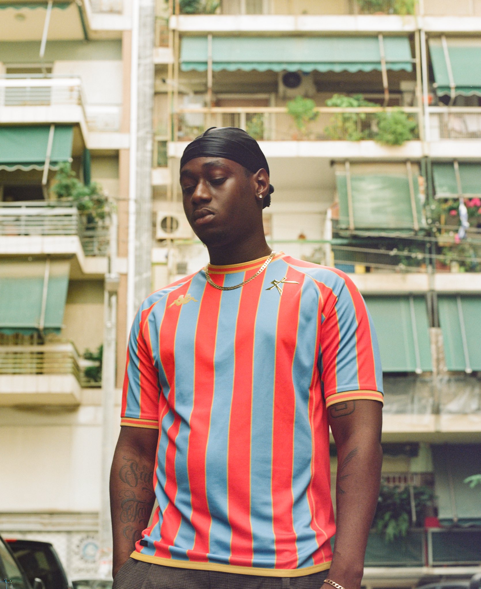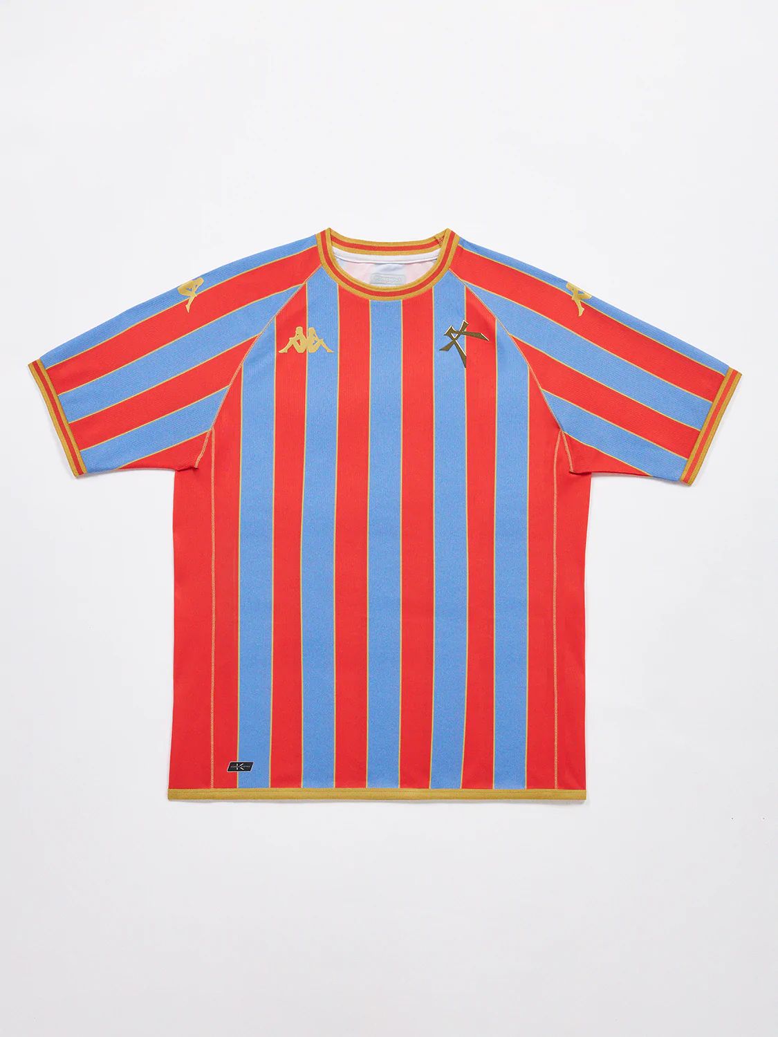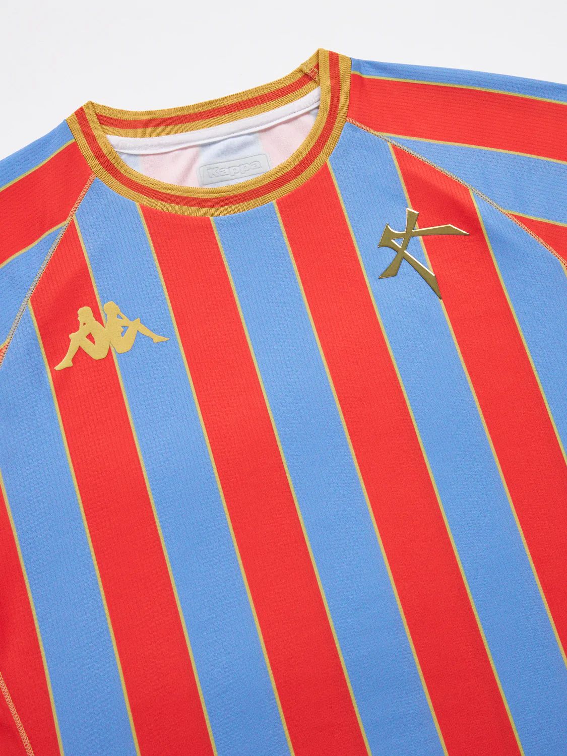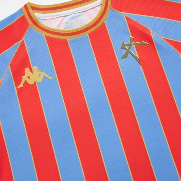In soft red and blue hues with gold accenting, the 22/23 AKFC third shirt is a creative take on the red, blue, and gold flag of the Athens municipality of Kallithea.
