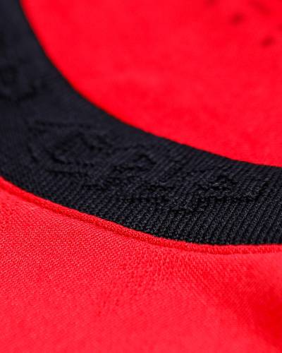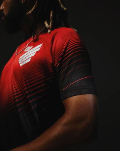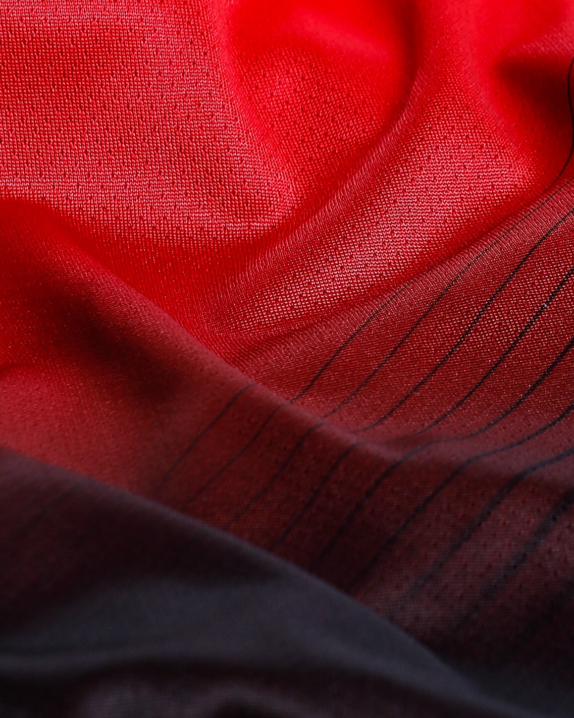 The shirt features a vertical black-to-red gradient, fading from the hem to the shoulders, combined with fine diagonal stripe detailing across the body and sleeves. The design is intended to reflect movement and strength, symbolising a transition from the club’s foundations to its future ambitions.