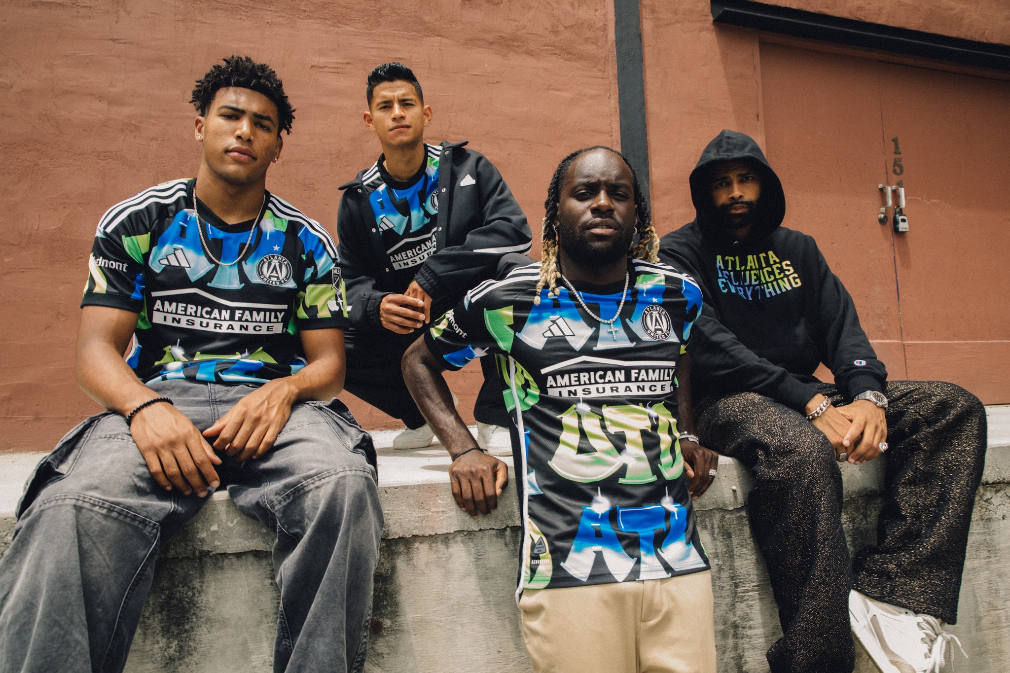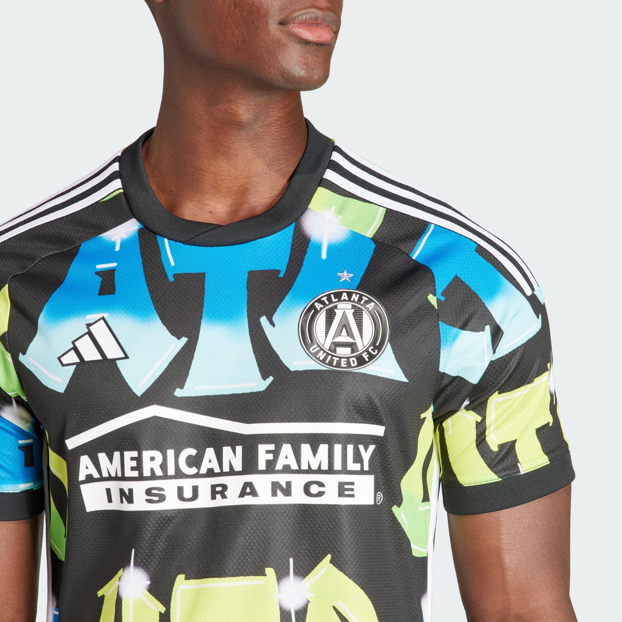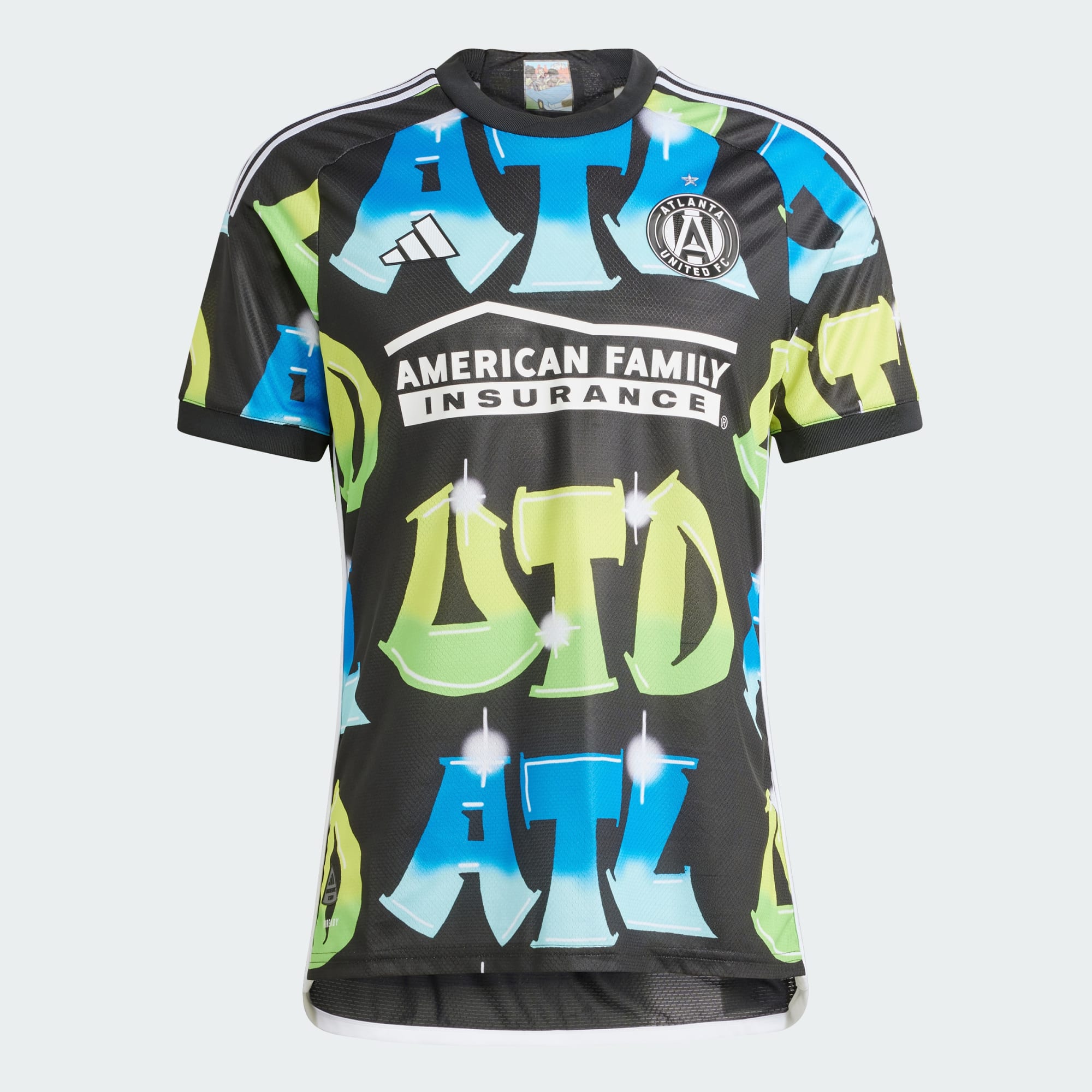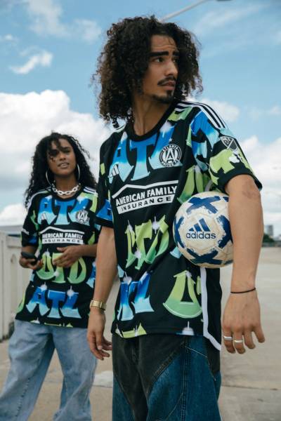 The design of 'The 404 Kit' showcases blue and green graffiti-style lettering of ATL and UTD on a black shirt. The use of blue signifies Atlanta's limitless possibilities, green symbolises the creative spirit that characterised the 1990s and pushed boundaries within the city, while black represents the enduring historical significance of Atlanta.