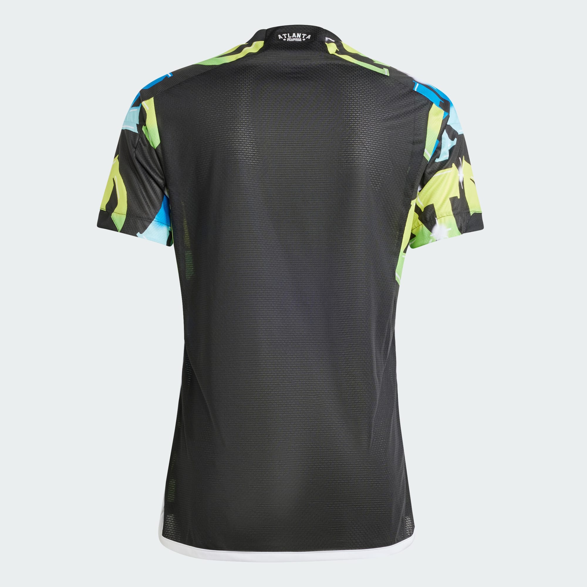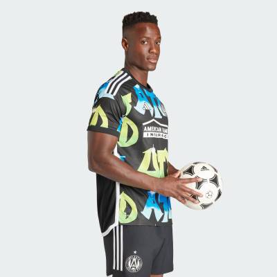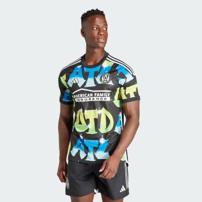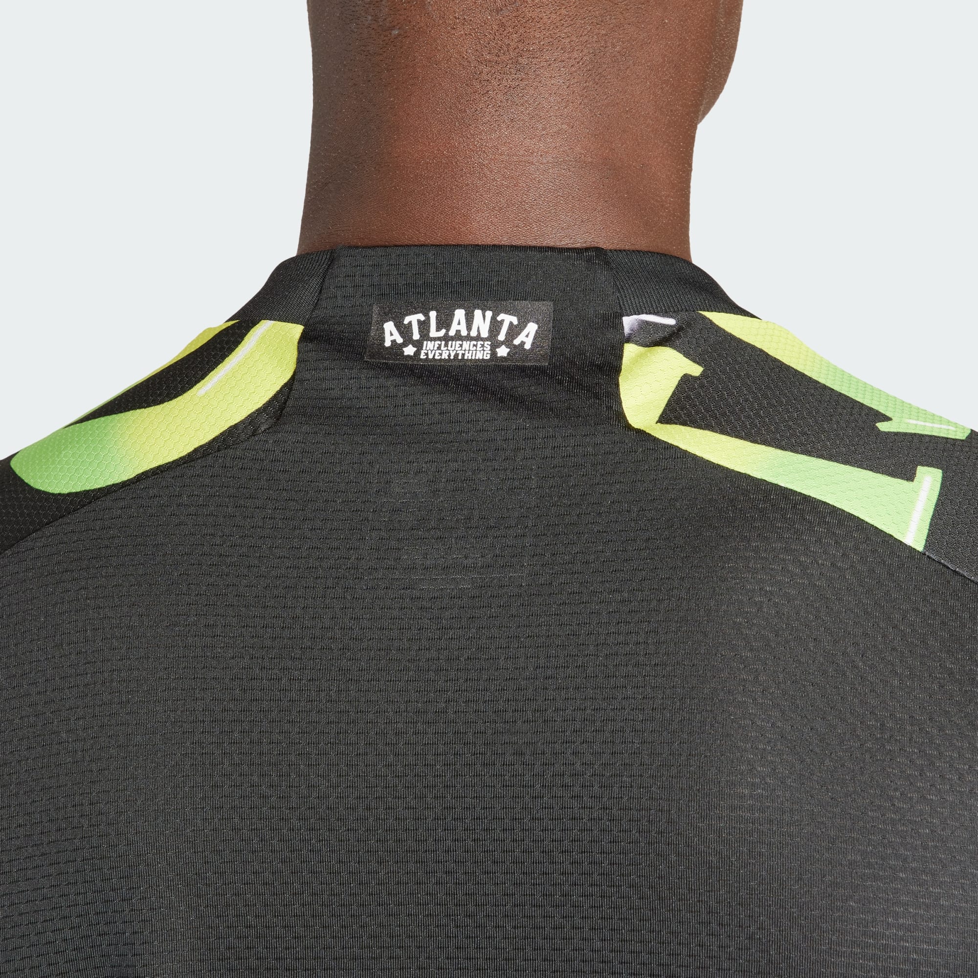 The design of 'The 404 Kit' showcases blue and green graffiti-style lettering of ATL and UTD on a black shirt. The use of blue signifies Atlanta's limitless possibilities, green symbolises the creative spirit that characterised the 1990s and pushed boundaries within the city, while black represents the enduring historical significance of Atlanta.