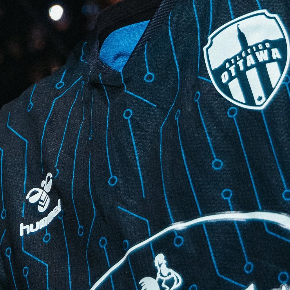 The new Atlético Ottawa jersey is presented in a dark navy base, detailed with an all-over tonal circuit-inspired graphic in electric blue. The linear pattern runs vertically across the front and sleeves, creating a consistent technical motif throughout the body of the shirt.