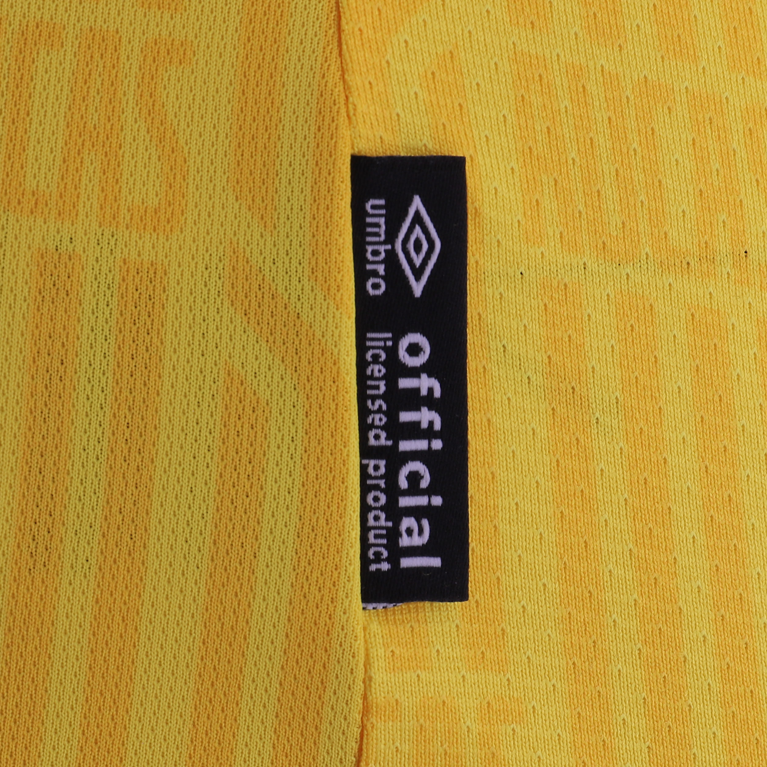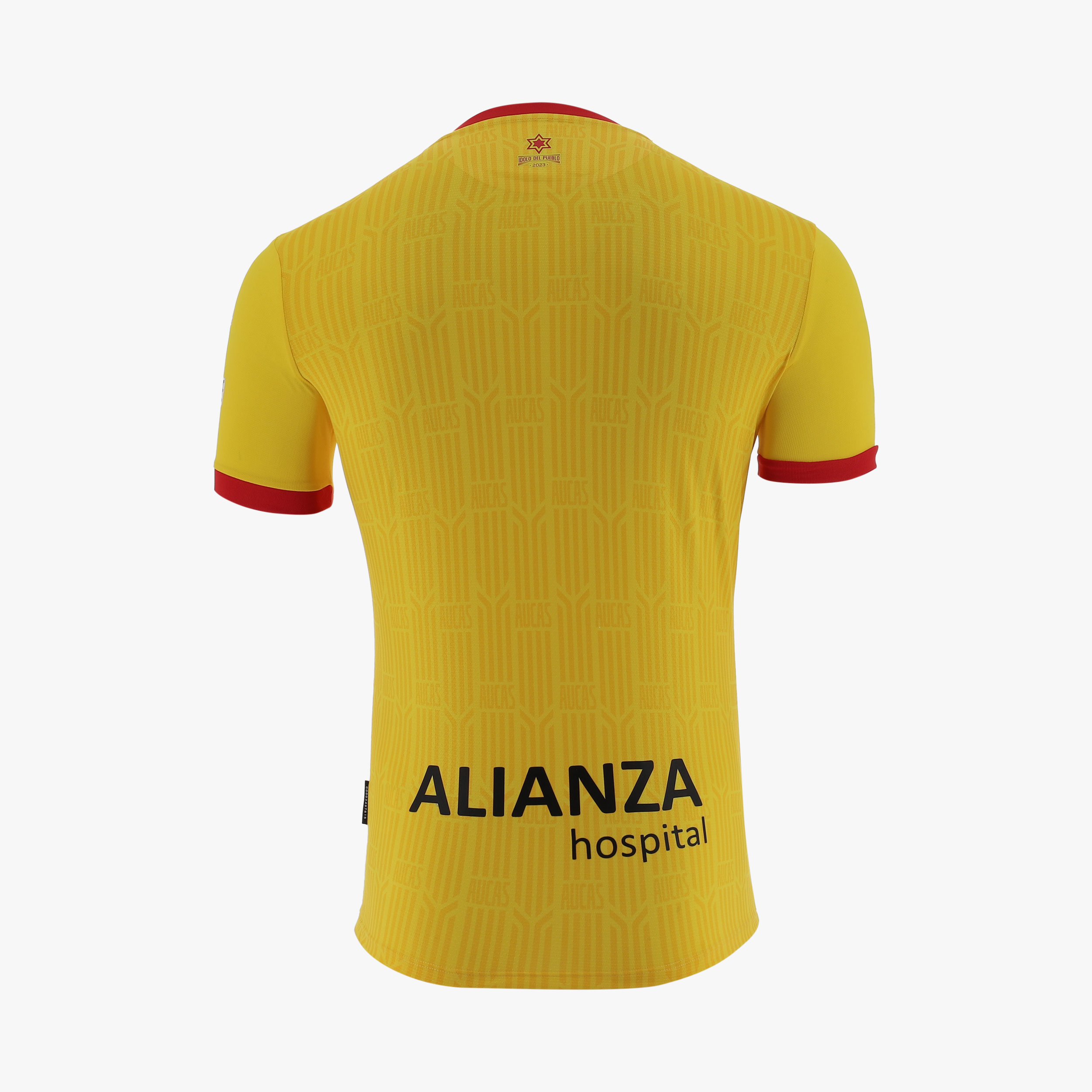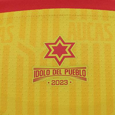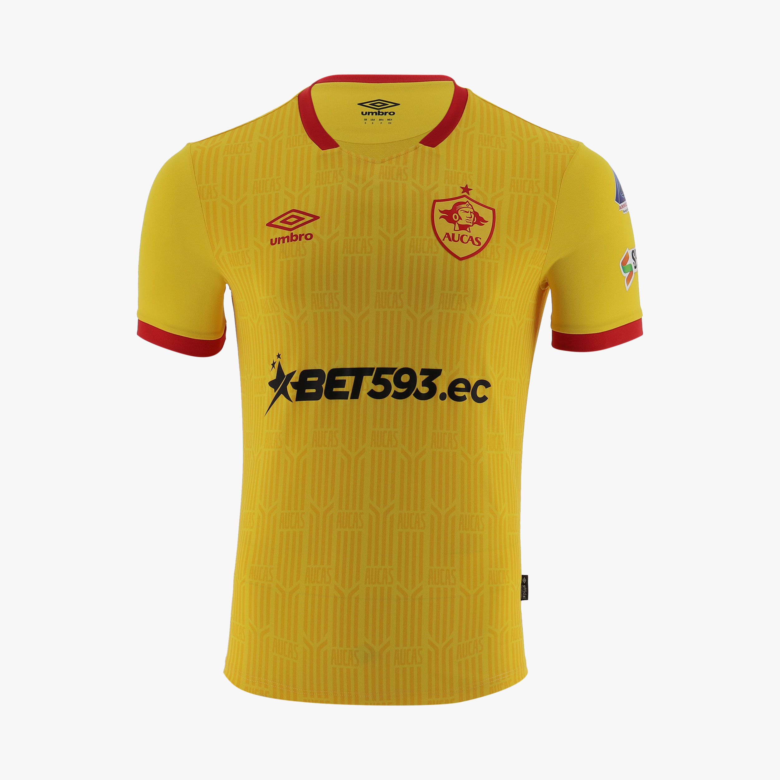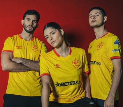 The Ecuadorian champions’ 2023 primary release by Umbro is in yellow with red trim and a base pattern featuring a repetition of the club name.