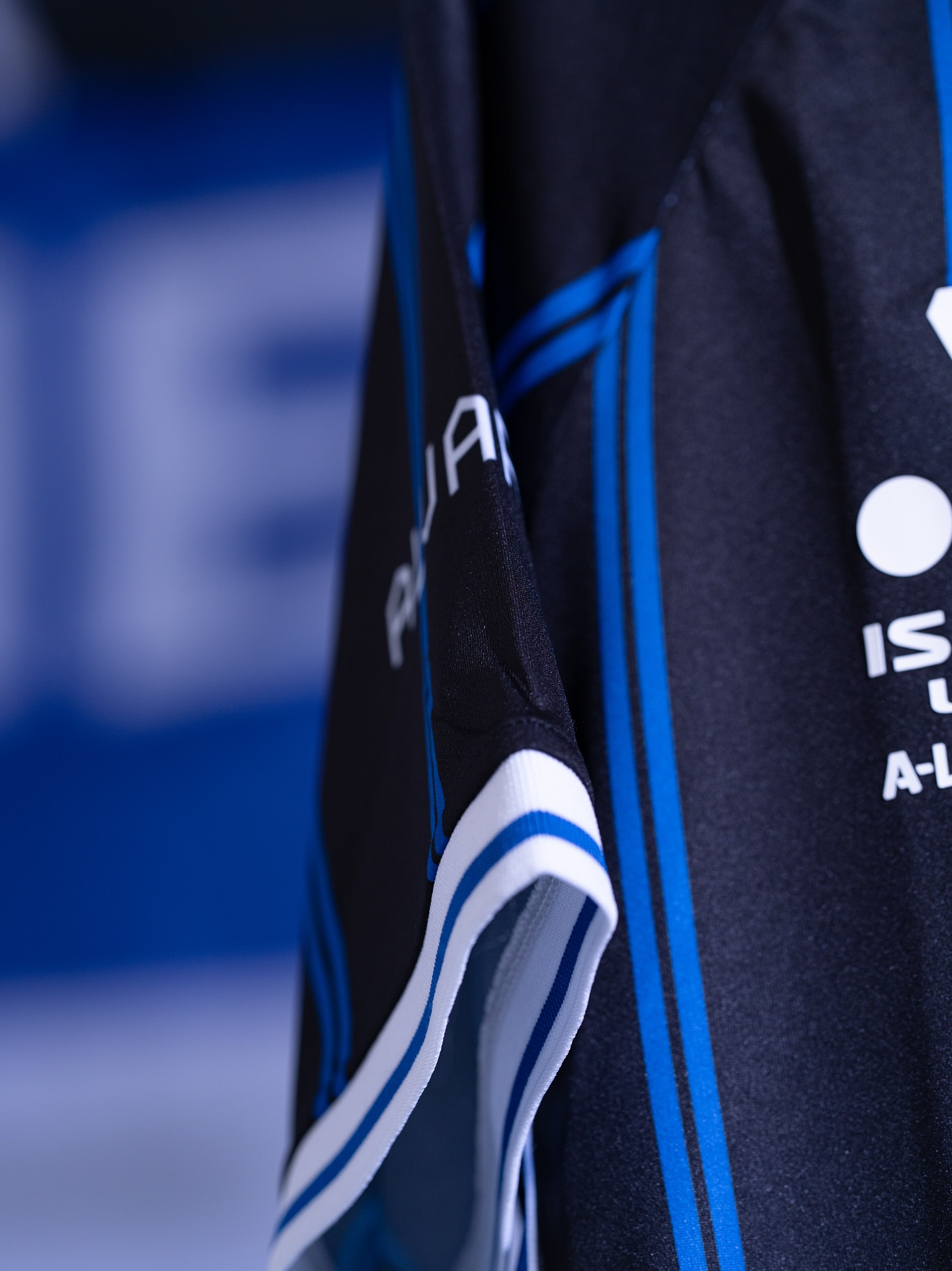 The home shirt comes in black with parallel electric blue pinstripes running vertically. It is finished with a white ribbed V-neck collar and sleeve cuffs, each detailed with blue trim. The club crest, New Balance logo, league branding and main sponsor ANZ feature on the front, with additional sponsors on the sleeves.