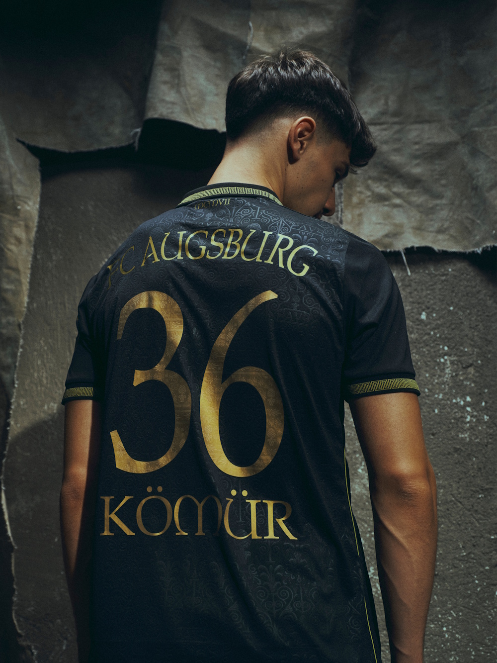 The jersey is black with an all-over embossed pattern referencing Roman antiquities and elements of the club’s crest. All logos, including those of Mizuno and the sponsors, appear in gold. The same gold tone is used for the sleeve cuffs, collar trim, and player name and number on the back, which are printed in a Roman-style font. The club’s founding year, 1907, is shown in Roman numerals at the back of the neck, with ‘FC Augsburg’ lettering placed below.