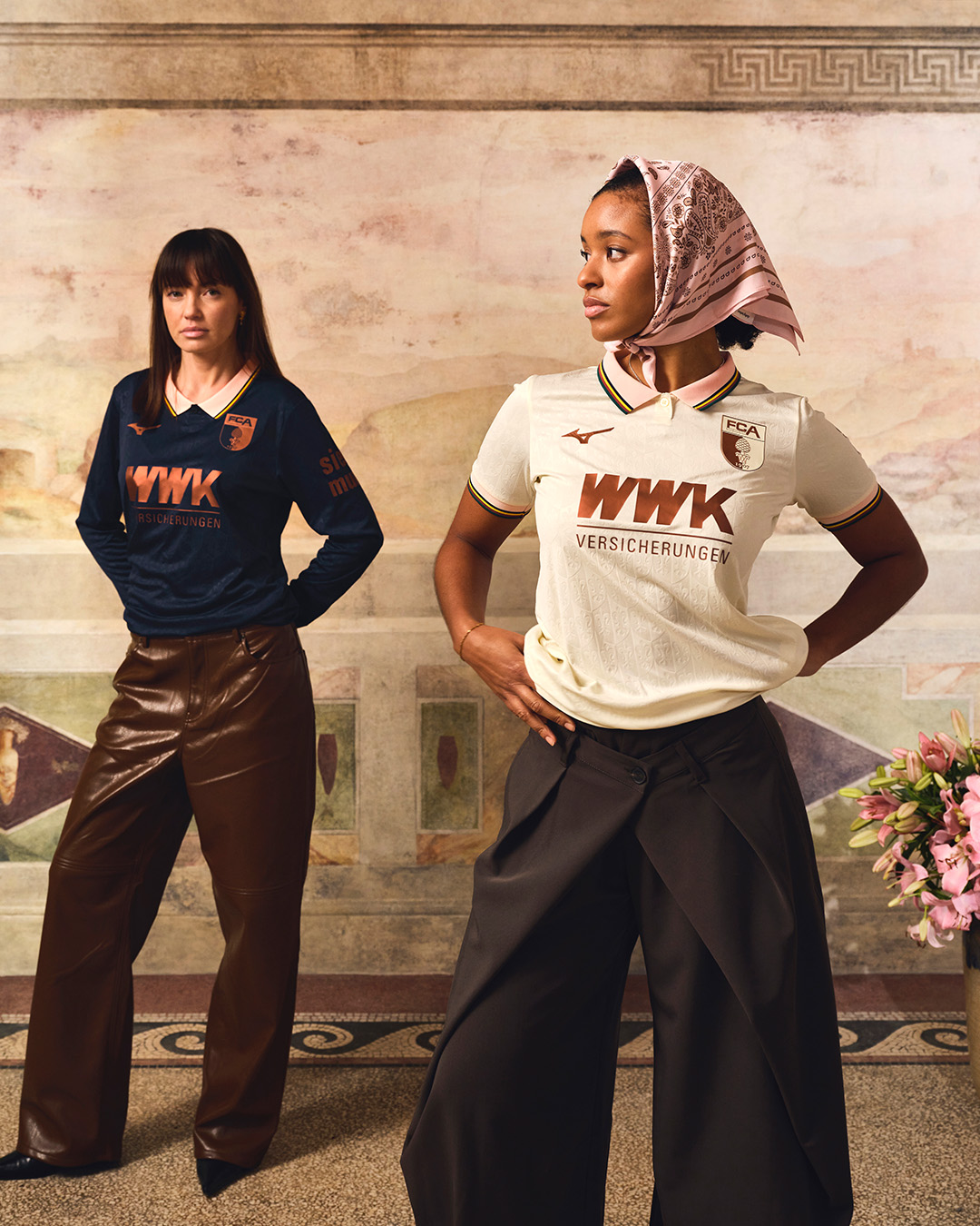 Both shirts carry an all over tonal pattern incorporating the Fugger lily crest, embossed across the fabric. The Augsburg crest is applied in a copper tone, matched by the Mizuno logo and main shirt sponsor WWK. Copper detailing references the Fugger family’s role in European copper trading during the 16th century.