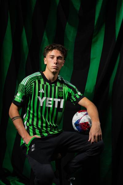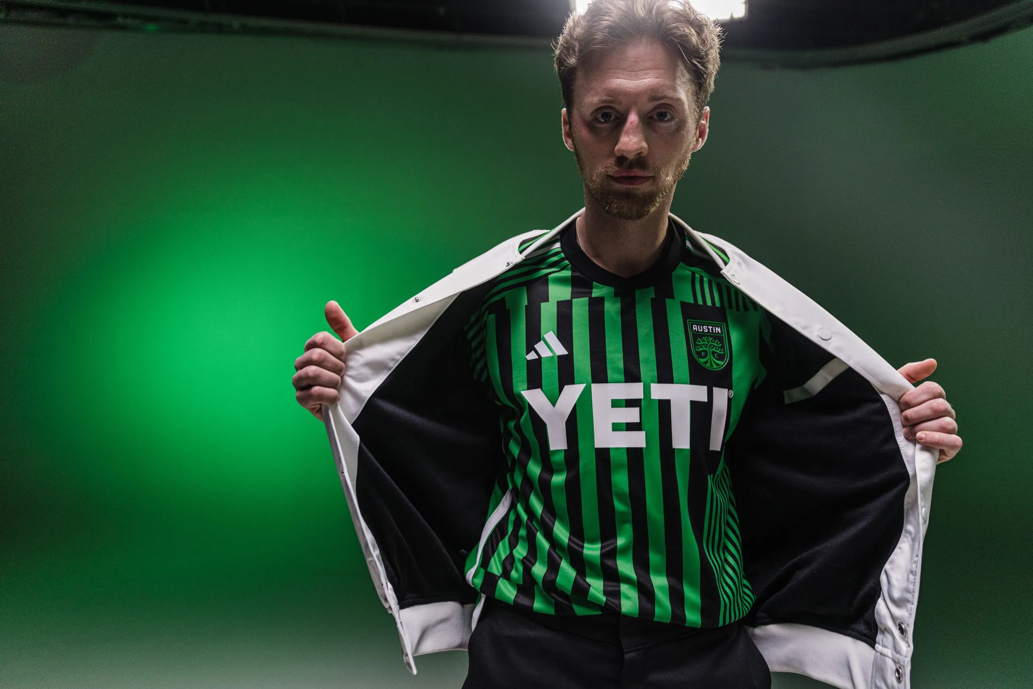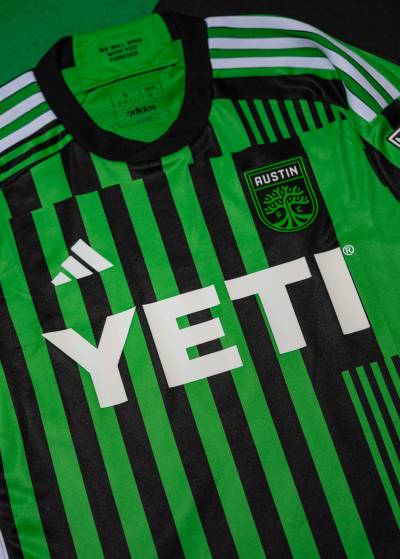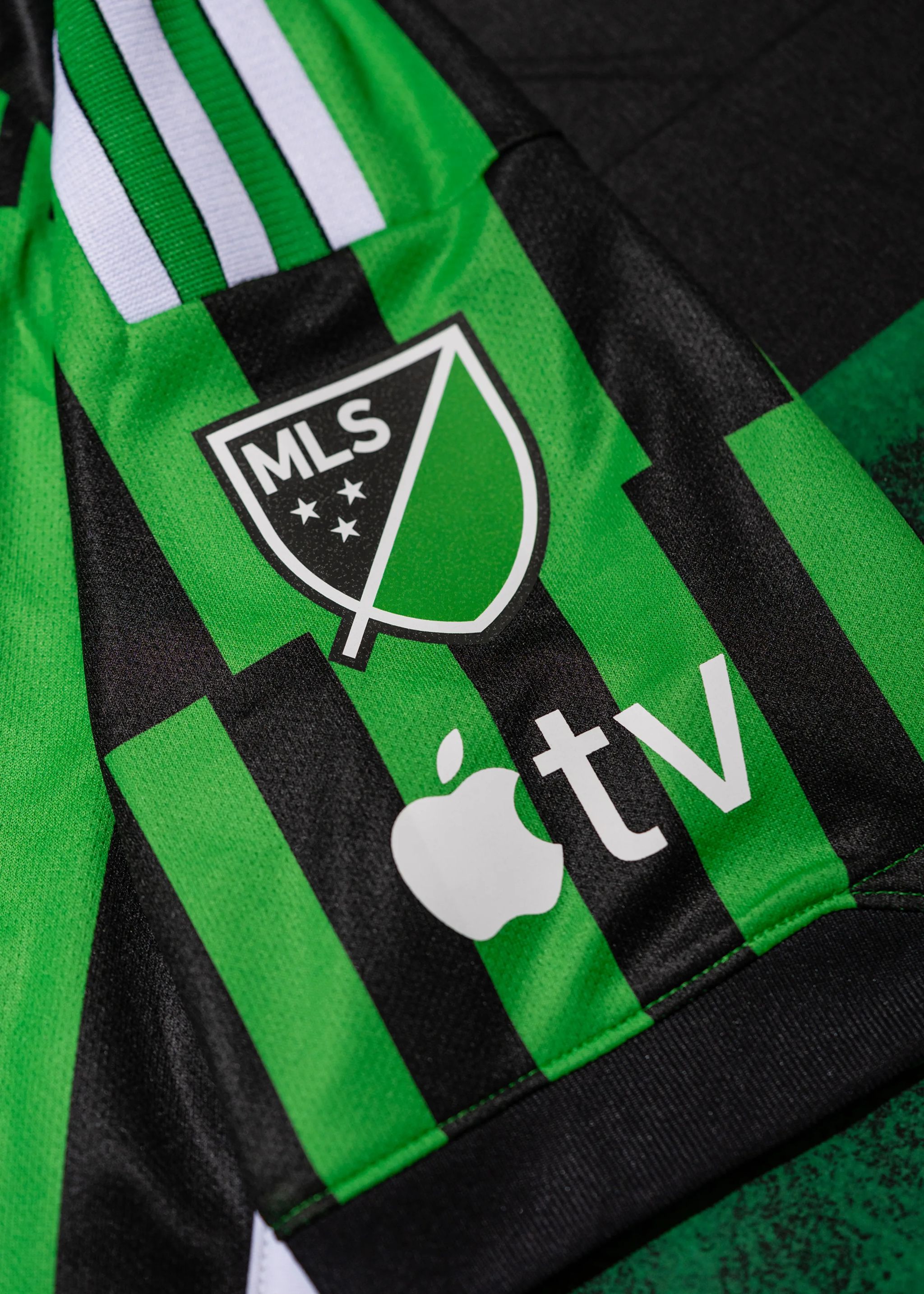 The "Las Voces Kit" (The Voices Kit) features local partners YETI as the front-of-jersey sponsor and Netspend on the right sleeve. This year, Apple TV will appear on the left sleeve alongside the MLS crest, which will be seen on all MLS club jerseys.