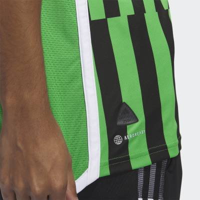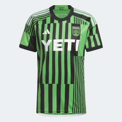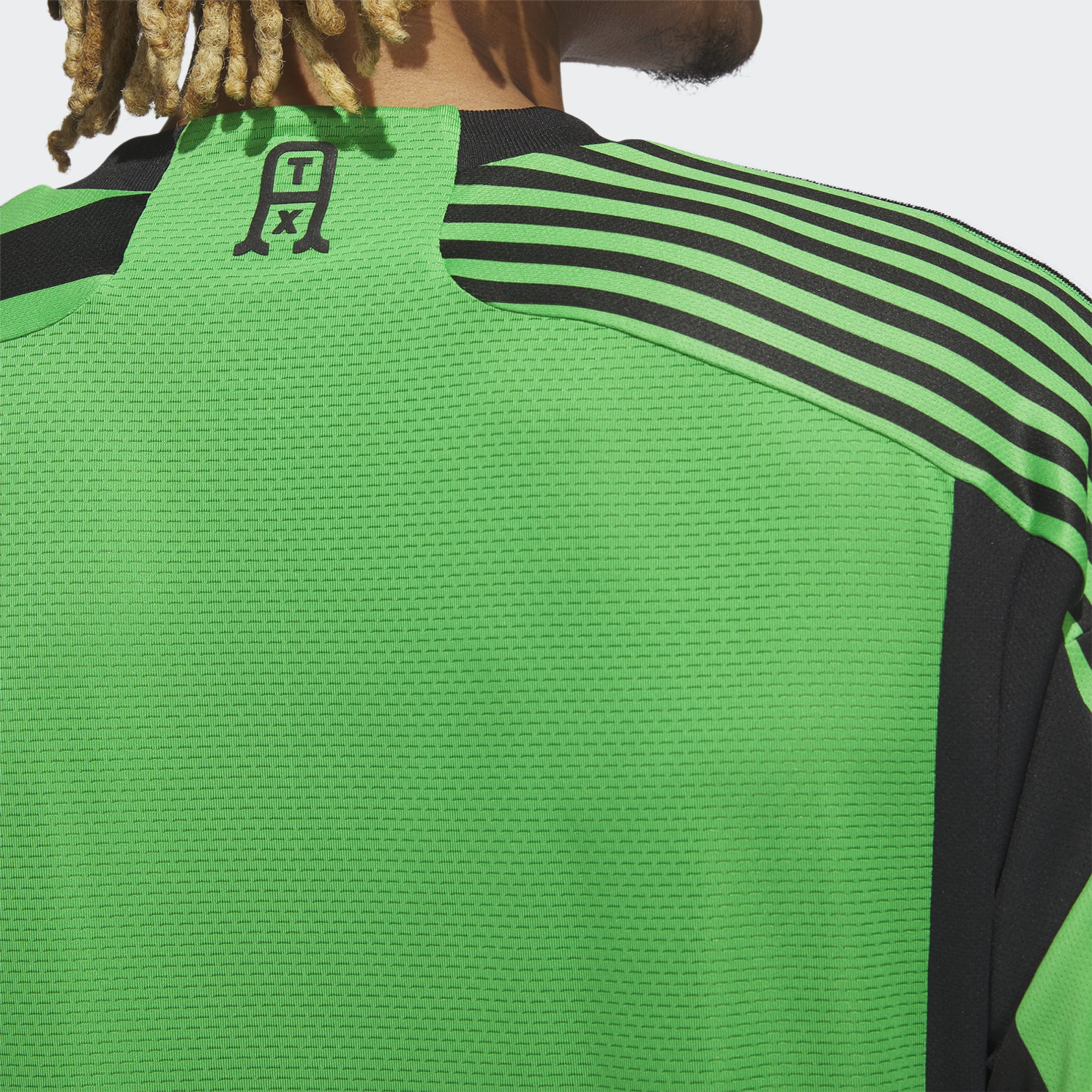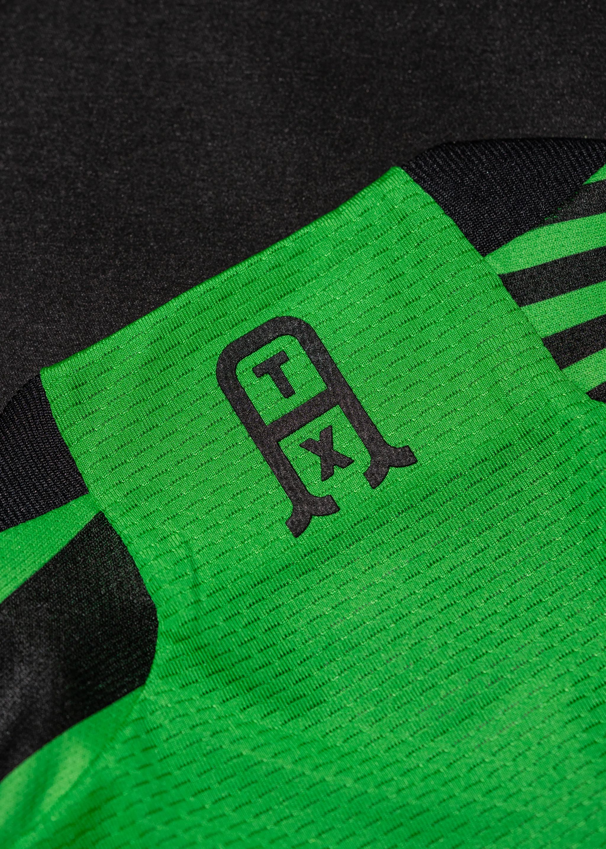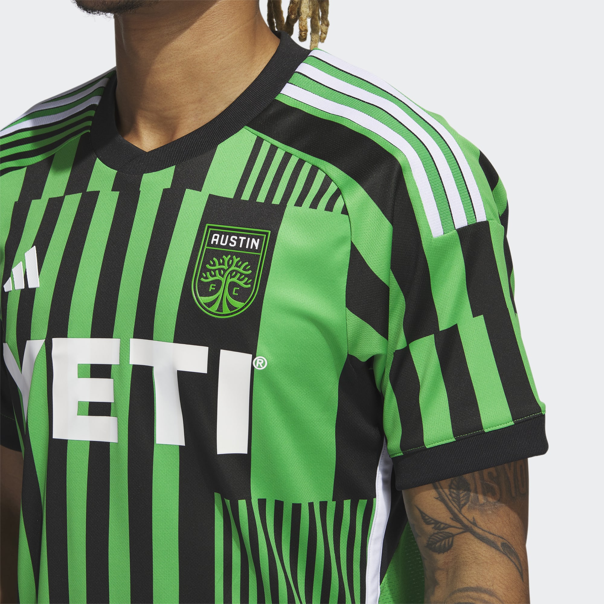 The primary design of the adidas kit showcases several patterns in Verde & Black, which embodies the unique perspective of Austin, bringing together voices from the Austin FC community.