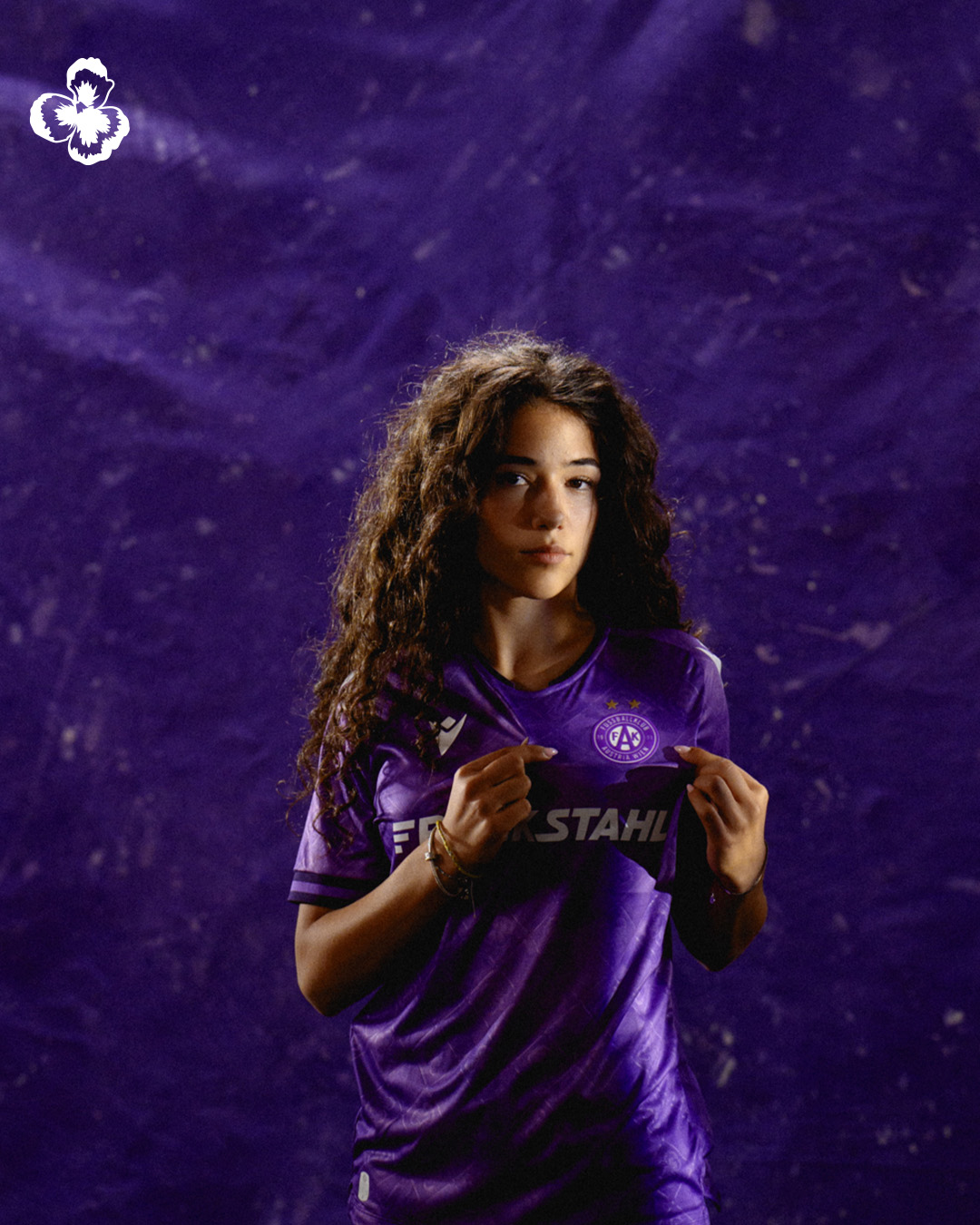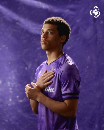 The new purple primary release from new supplier Macron has a debossed violet (flower) pattern across the fabric - nodding to the club nickname - and this combines with a mottled tonal effect, upon which the club crest and the white partner/sponsor logos are placed.