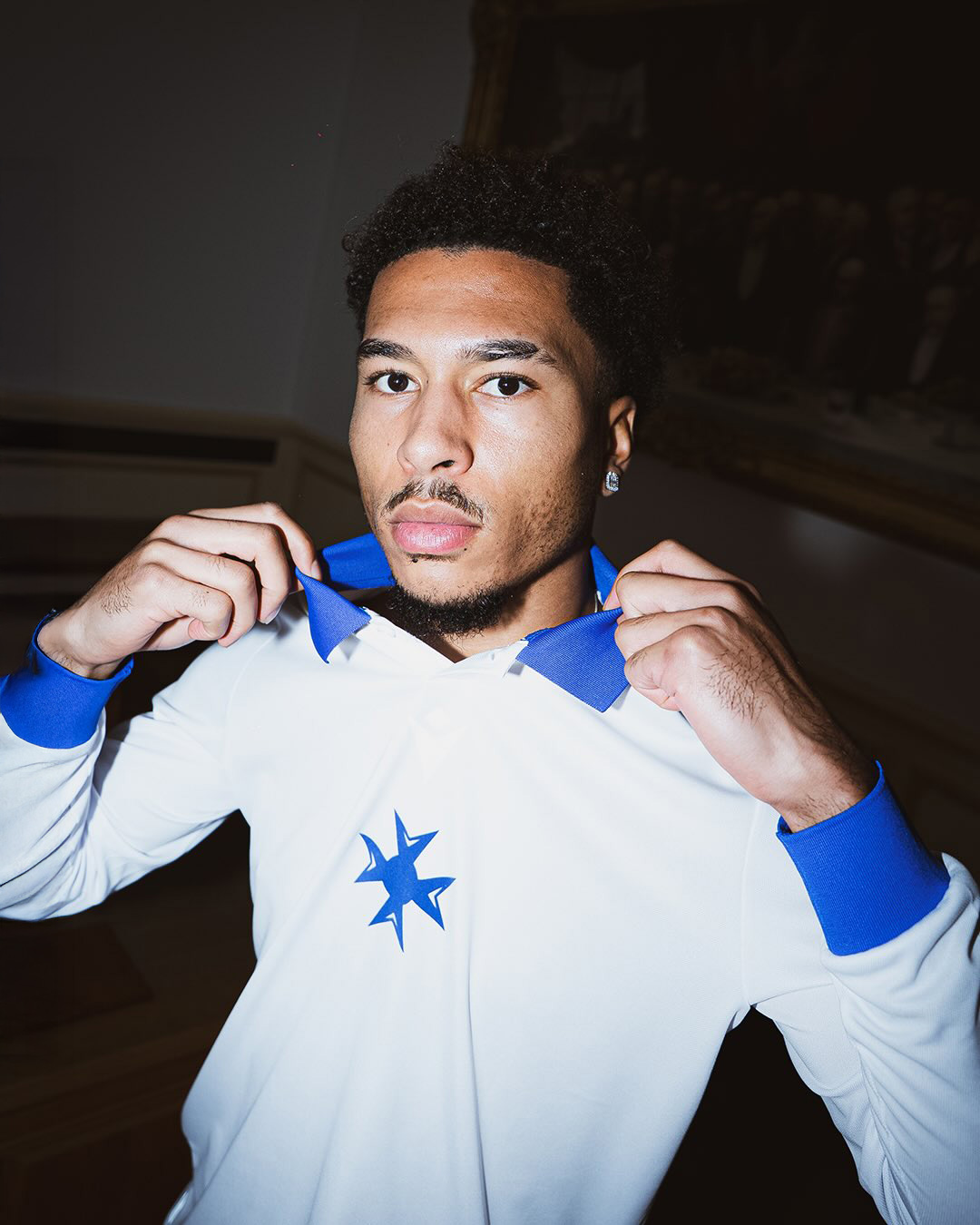 The Auxerre football shirt uses a white base, drawing reference from early Auxerre kits through a restrained historical layout. A classic blue polo collar with a single button closure features prominently, complemented by matching blue sleeve cuffs. Central to the anniversary shirt is a heritage emblem in place of the modern club crest. Central to the anniversary shirt is a heritage emblem in place of the modern club crest, featuring a Maltese cross closely associated with the city of Auxerre and its early identity. Its inclusion references the club’s origins in 1905 and reflects the local roots that shaped AJ Auxerre during its formative years.