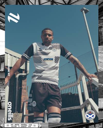 Unveiled in full fabric form - as opposed to the design being painted on models, as was once Ayr United’s wont - the 2023-24 primary release boasts a white trunk with elaborate black graphical embellishment and black sleeves.