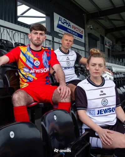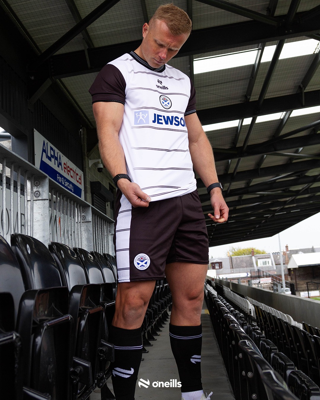 The club’s badge appears centrally on the chest, positioned beneath the O’Neills logo. Shirt sponsor Jewson is prominently displayed across the midsection. The look is completed with black shorts and socks, both featuring white accents, forming the full home kit.