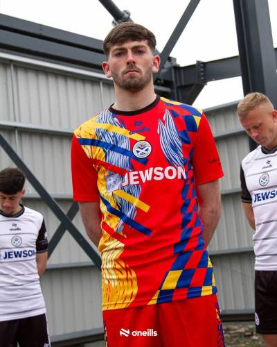 The goalkeeper shirt, shown alongside the home strip, is bright red with bold abstract graphics in yellow and blue, also branded with the club crest, O’Neills, and Jewson logos.