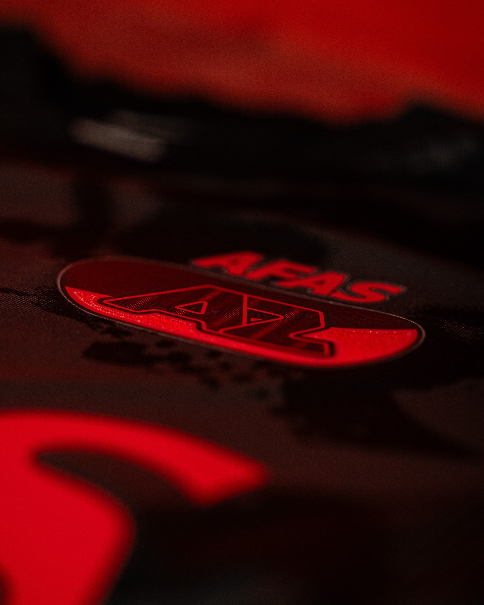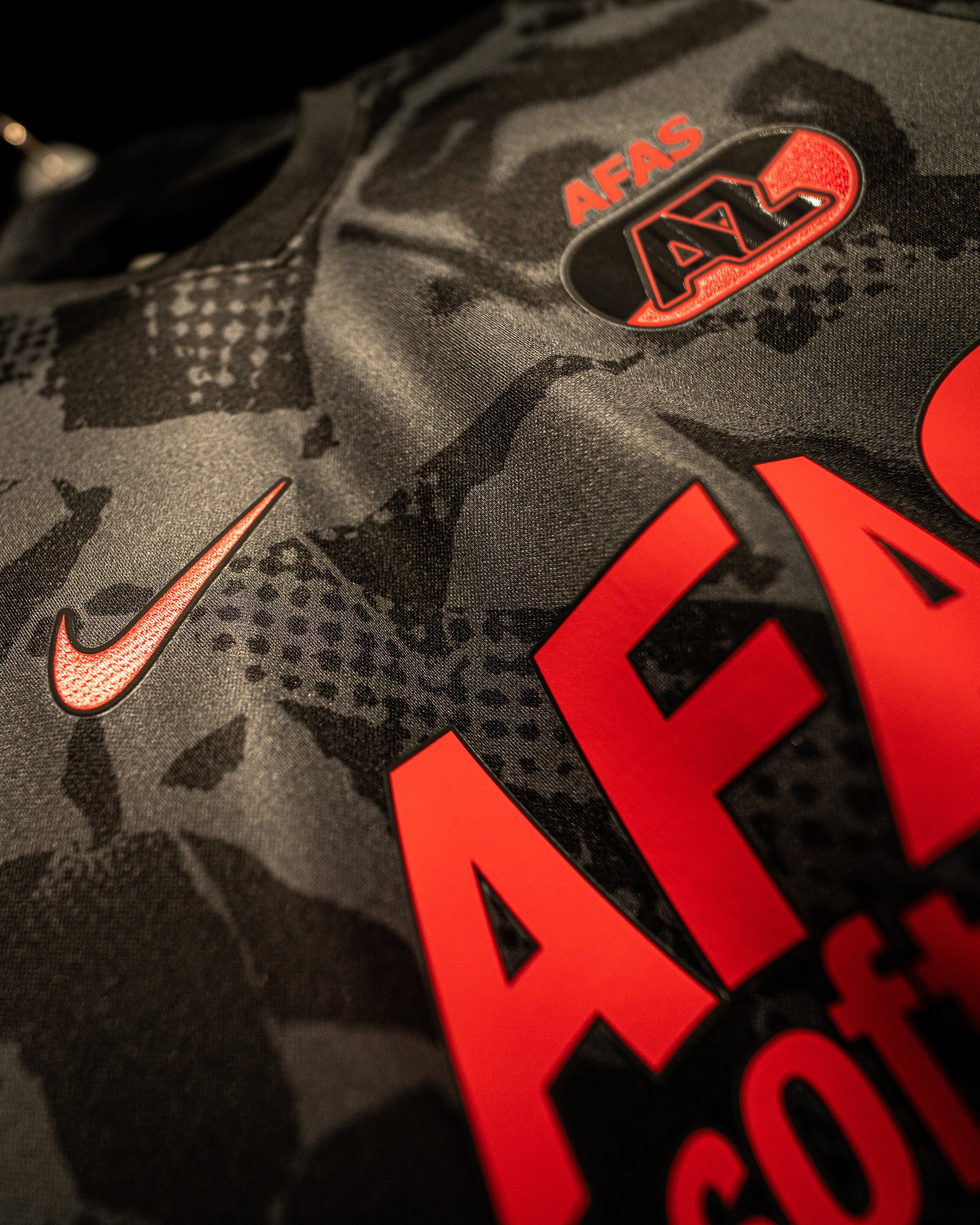 The Nike shirt features a black base with a distinctive tonal pattern, giving each jersey a unique design. Red detailing, including the Nike Swoosh and AFAS Software sponsor logo, while a subtle reference to the 2019/20 away kit is included on the back of the neck.
