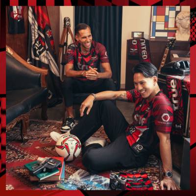 The new red-and-black Ari Football creation is in a “mashup” style and features several shirt patterns from the Angels’ ten-year association with the Thai brand, while the crest is in full colour and the partner/sponsor logos are in white.