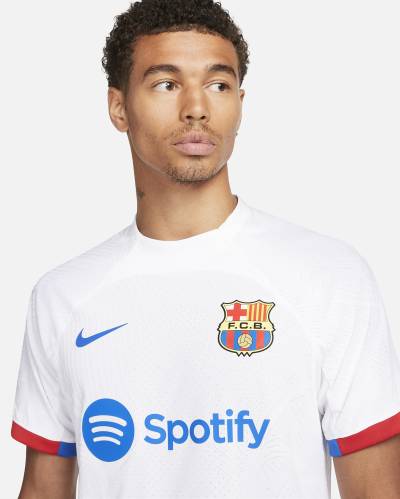 Completing the ensemble are blue shorts and red and blue striped socks, featuring the word "BARÇA" and the Nike logo at the centre. The second kit will be available with the Spotify logo on the front (the main partner for both the men's and women's teams), alongside the Nike logo.
